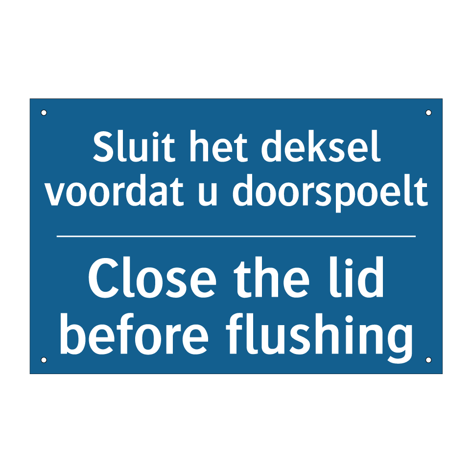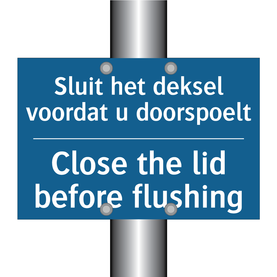 Verplichte bord met de tekst Sluit het deksel voordat u doorspoelt - Close the lid before flushing