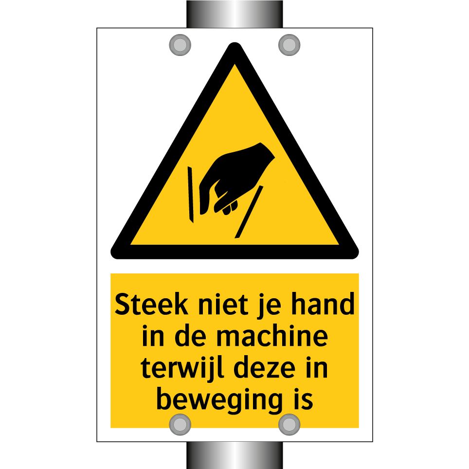 Waarschuwingsbord met de tekst Steek niet je hand in de machine terwijl deze in beweging is