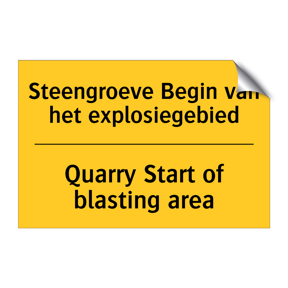 Waarschuwingsbord met de tekst Steengroeve Begin van het explosiegebied / Quarry Start of blasting area