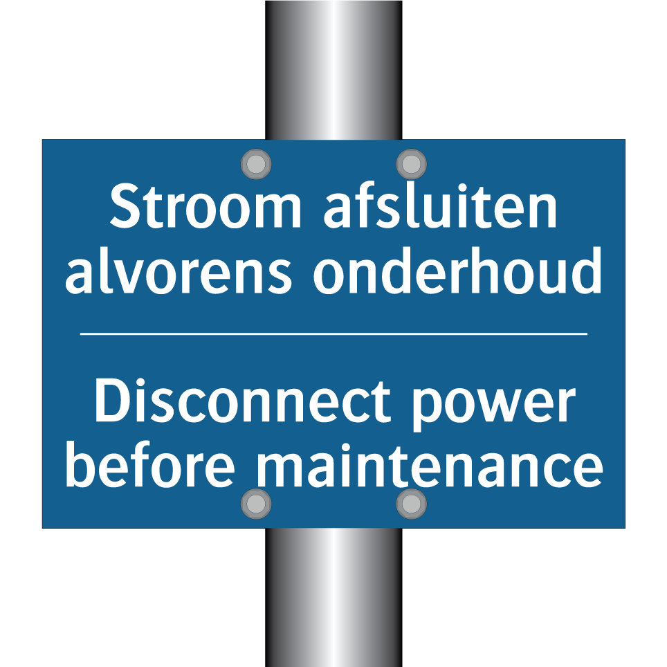 Verplichte bord met de tekst Stroom afsluiten alvorens onderhoud - Disconnect power before maintenance