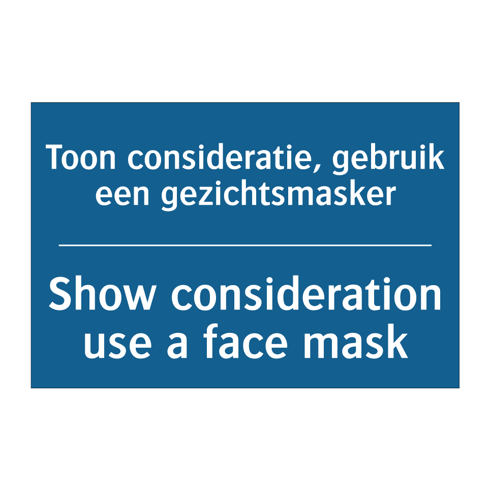 Deze verplichte bord is ideaal voor het bevorderen van veiligheid en gezondheid in diverse omgevingen. Met een duidelijke boodschap in zowel het Nederlands als het Engels, moedigt het bord bezoekers en personeel aan om een gezichtsmasker te dragen uit respect voor anderen. Dit tweetalige ontwerp maakt het geschikt voor internationale locaties zoals luchthavens, treinstations en toeristische attracties, waar een diverse groep mensen samenkomt. Het bord kan strategisch worden geplaatst bij ingangen, recepties of wachtruimtes om ervoor te zorgen dat iedereen de richtlijnen begrijpt en volgt. Door het gebruik van herkenbare symbolen en tekst, draagt dit verplichte bord bij aan een veilige en zorgzame omgeving.