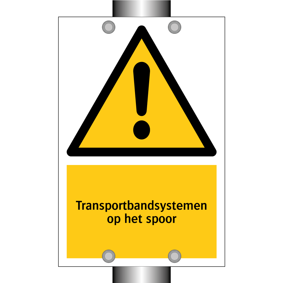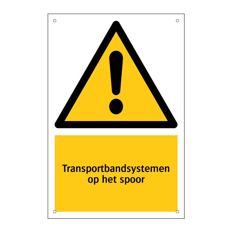 Waarschuwingsbord met de tekst Transportbandsystemen op het spoor