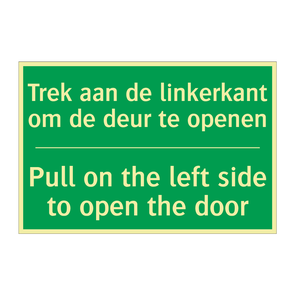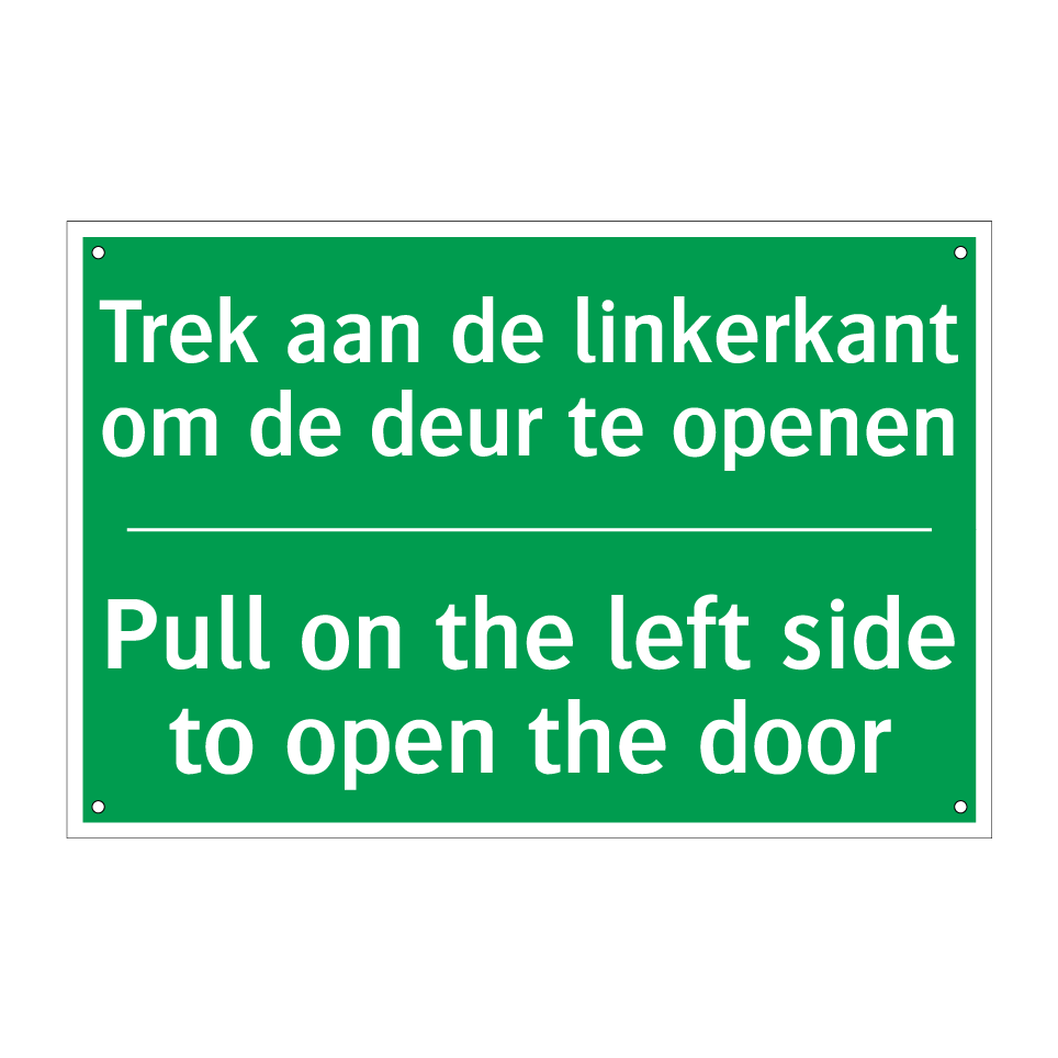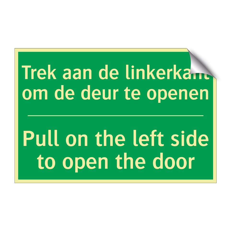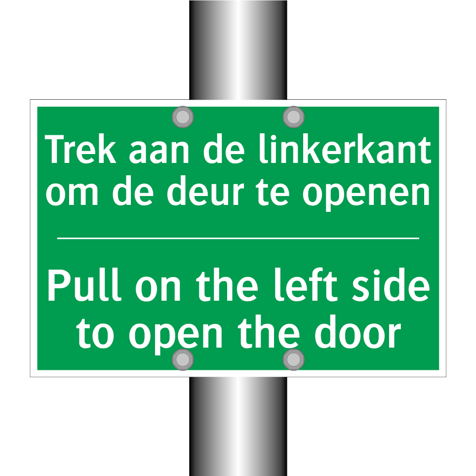 Noodbord met tekst Trek aan de linkerkant om de deur te openen / Pull on the left side to open the door