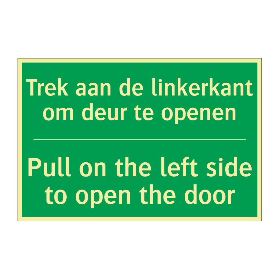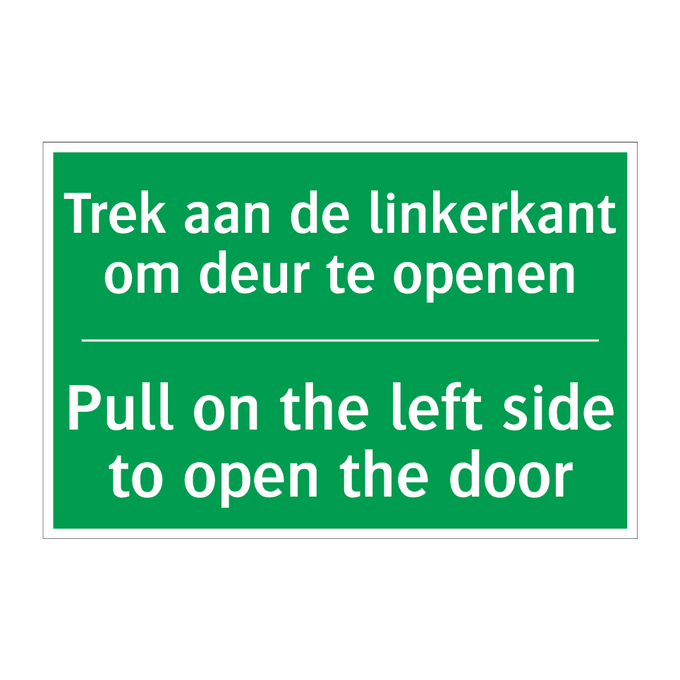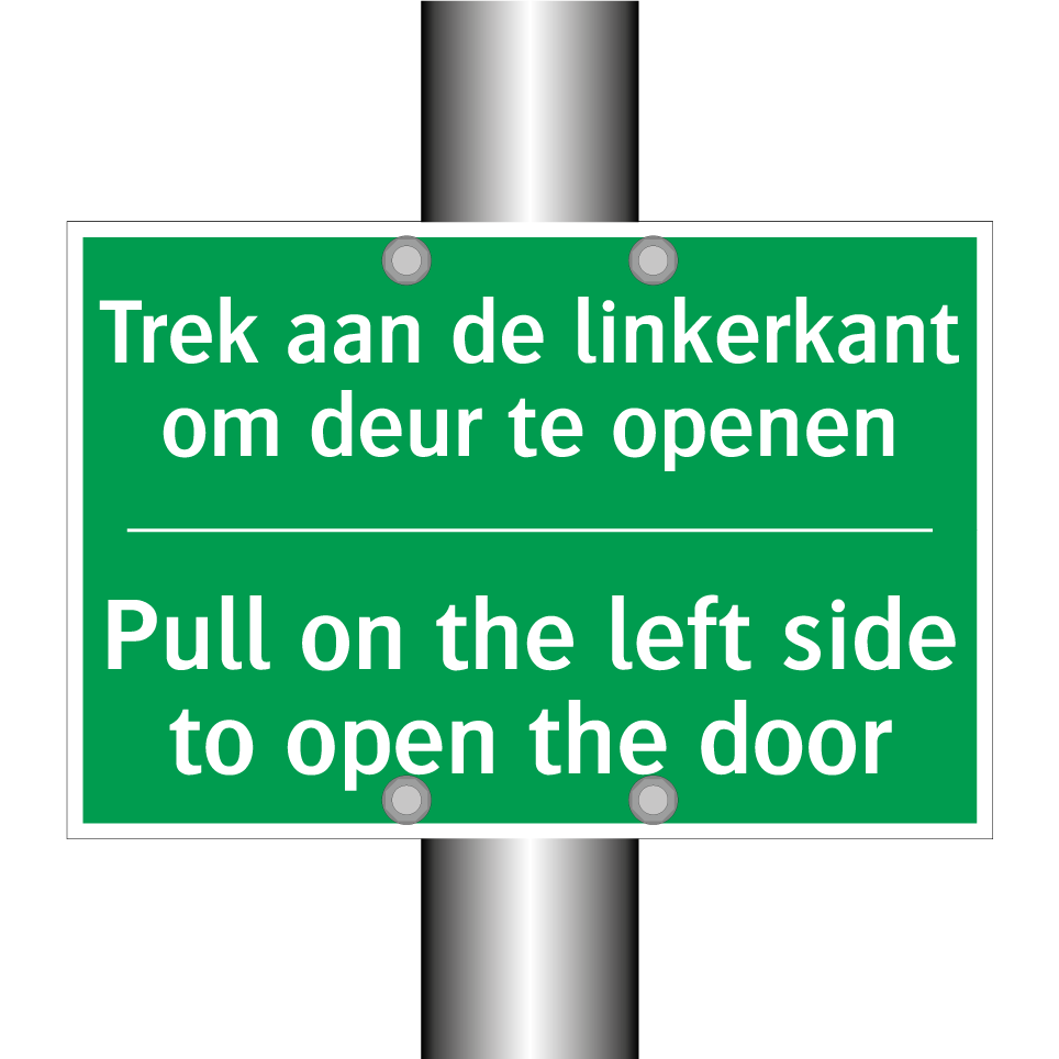 Noodbord met tekst Trek aan de linkerkant om deur te openen / Pull on the left side to open the door.