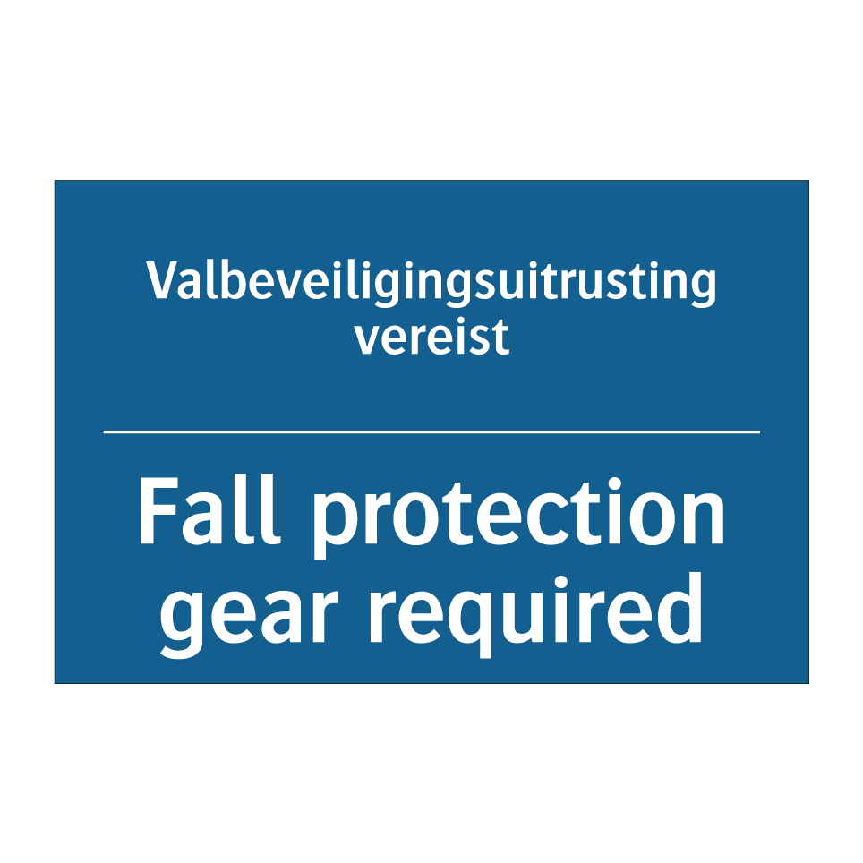 Verplichte bord met de tekst Valbeveiligingsuitrusting vereist - Fall protection gear required