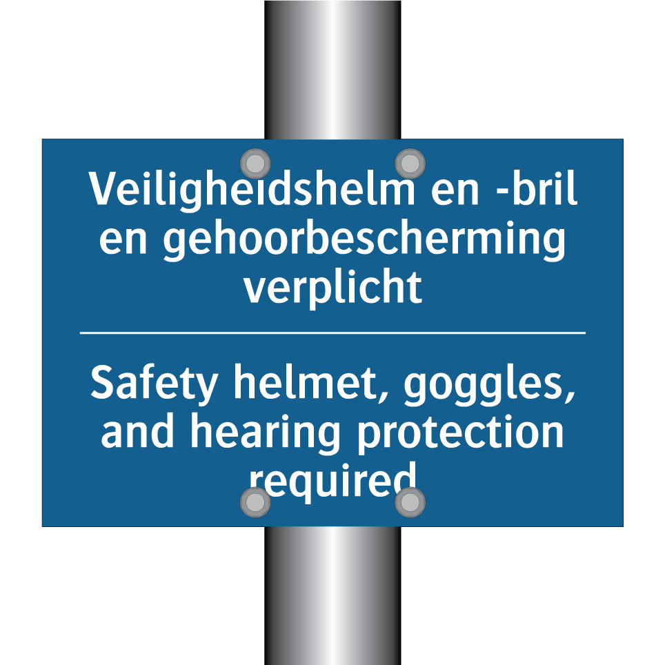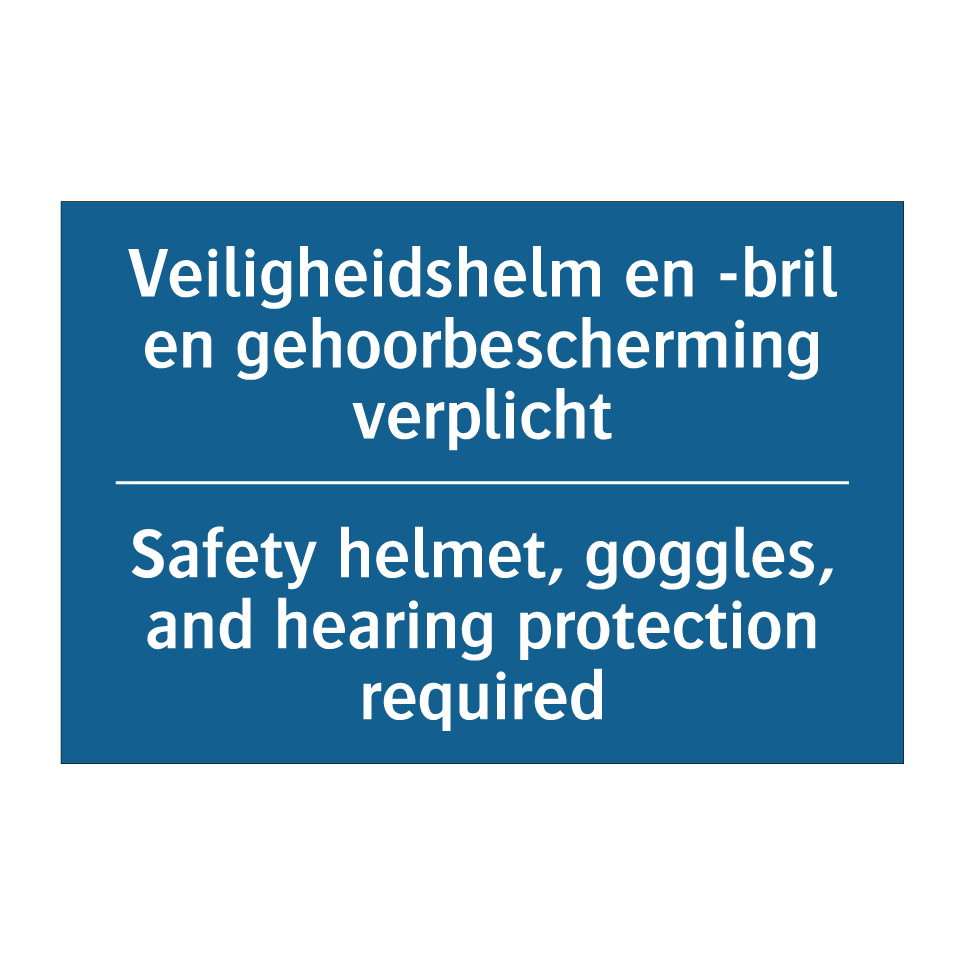 Verplichte bord met de tekst Veiligheidshelm en -bril en gehoorbescherming verplicht - Safety helmet, goggles, and hearing protection required