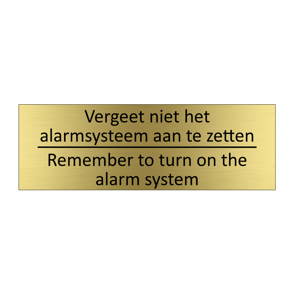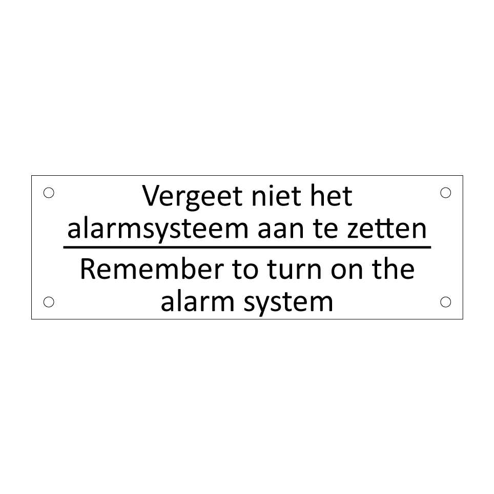 Informatiebord met tekst in het nederlands en engels. Dit bord luidt: Vergeet niet het alarmsysteem aan te zetten evenals met de engelse vertaling Remember to turn on the alarm system.