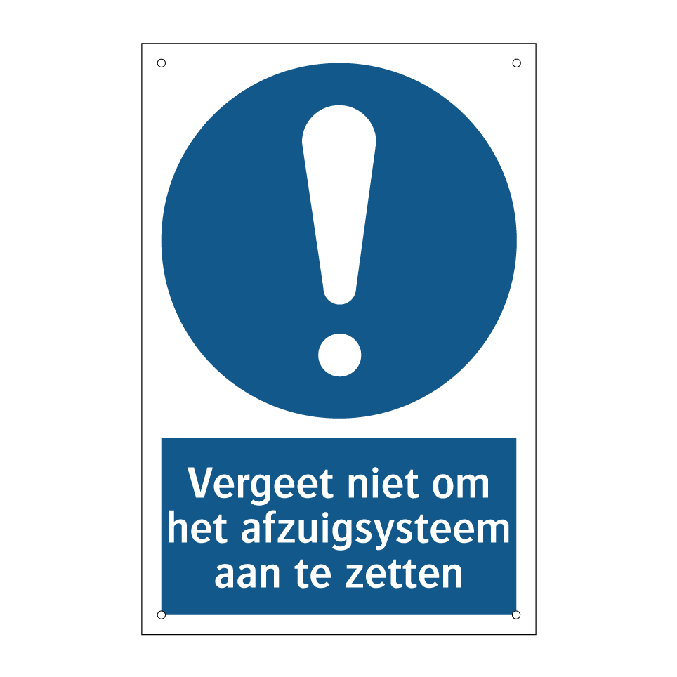 Deze verplichte bord herinnert werknemers eraan om het afzuigsysteem in te schakelen, wat essentieel is voor een veilige en gezonde werkomgeving. Ideaal voor gebruik in industriële omgevingen, werkplaatsen, laboratoria en andere ruimtes waar luchtkwaliteit van groot belang is. Door deze bord op strategische plaatsen te monteren, zoals bij ingangen, naast machines of in werkruimtes, wordt de kans op vergeten verminderd en wordt de veiligheid verhoogd. Deze duidelijke en opvallende bord zorgt ervoor dat iedereen zich bewust is van de noodzaak om het afzuigsysteem te activeren, wat bijdraagt aan een efficiënte en veilige werkomgeving.
