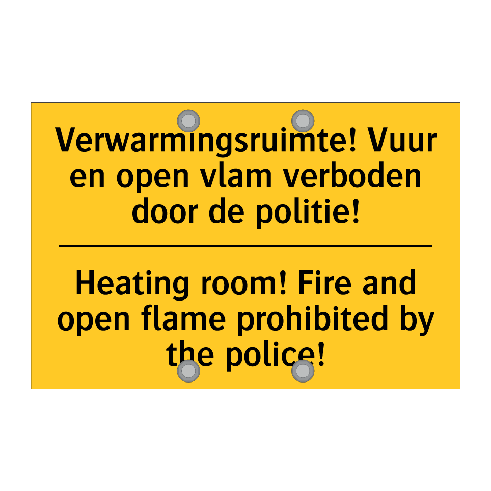 Waarschuwingsbord met de tekst Verwarmingsruimte! Vuur en open vlam verboden door de politie! / Heating room! Fire and open flame prohibited by the police!