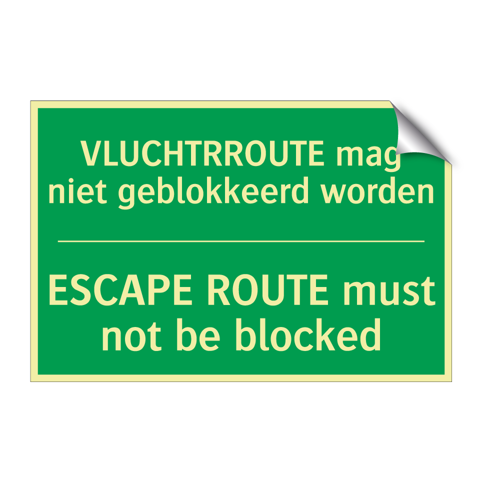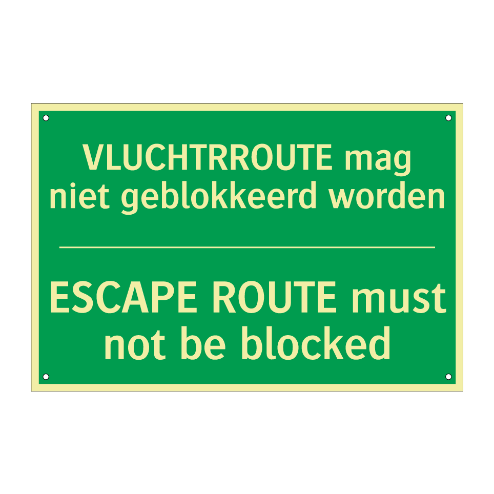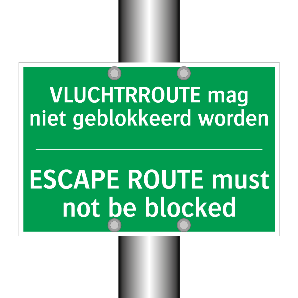 Noodbord met tekst VLUCHTRROUTE mag niet geblokkeerd worden / ESCAPE ROUTE must not be blocked