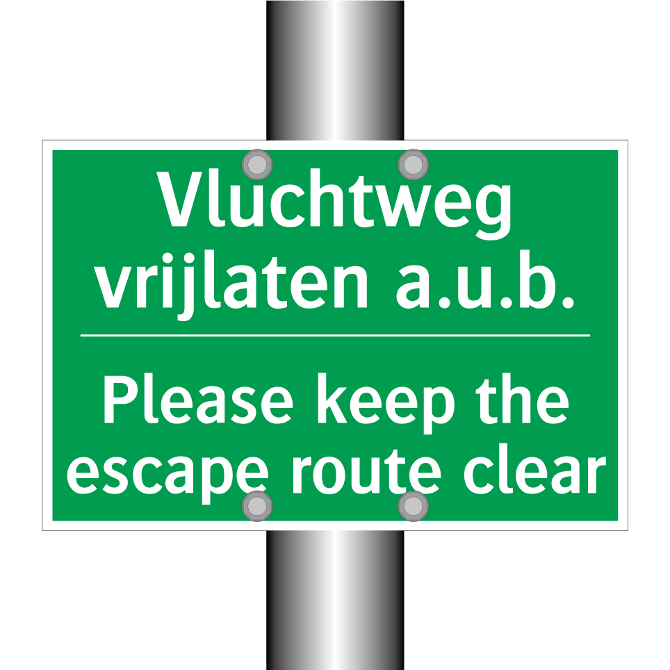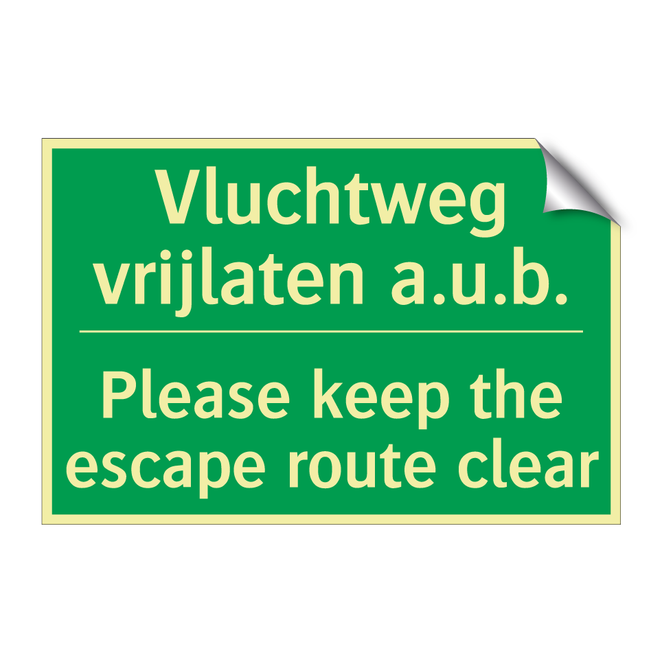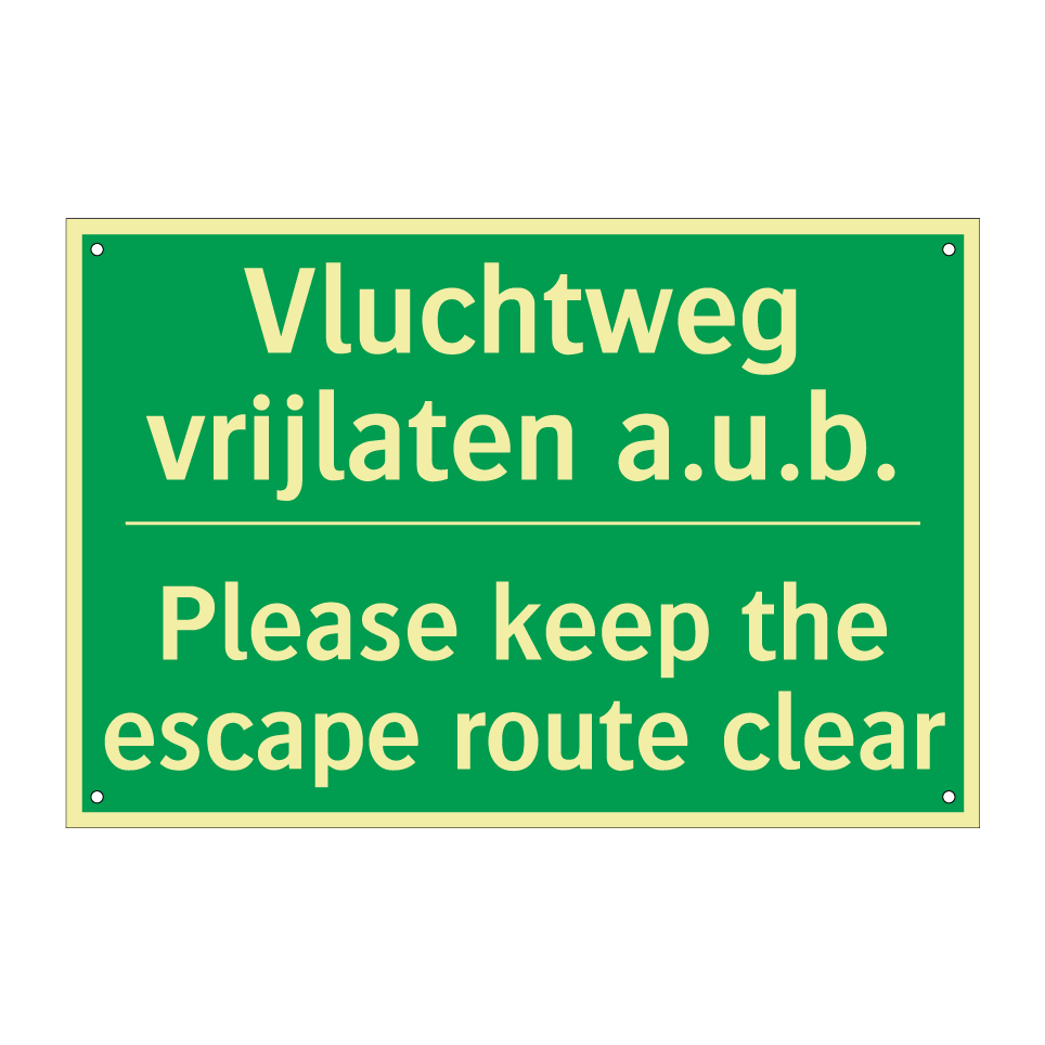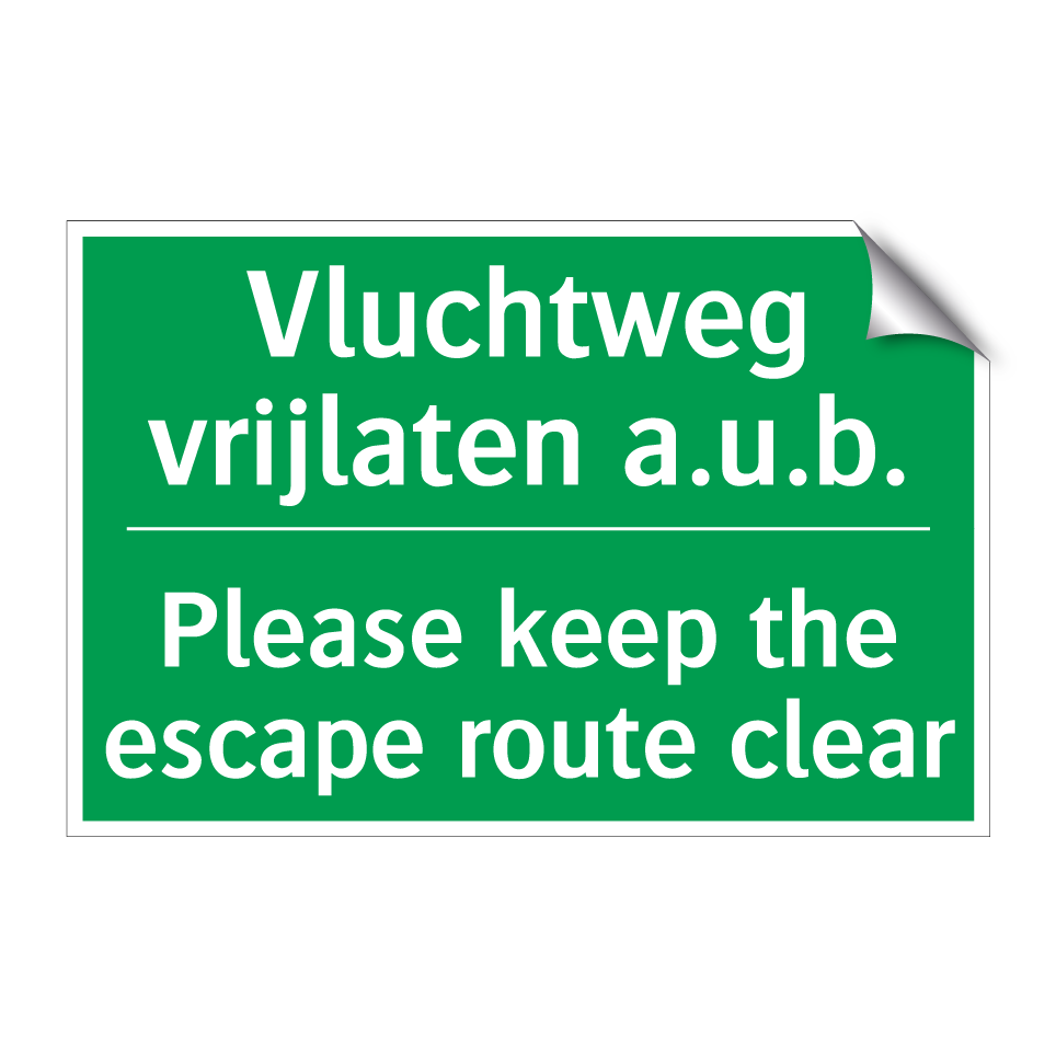 Noodbord met tekst Vluchtweg vrijlaten a.u.b. / Please keep the escape route clear