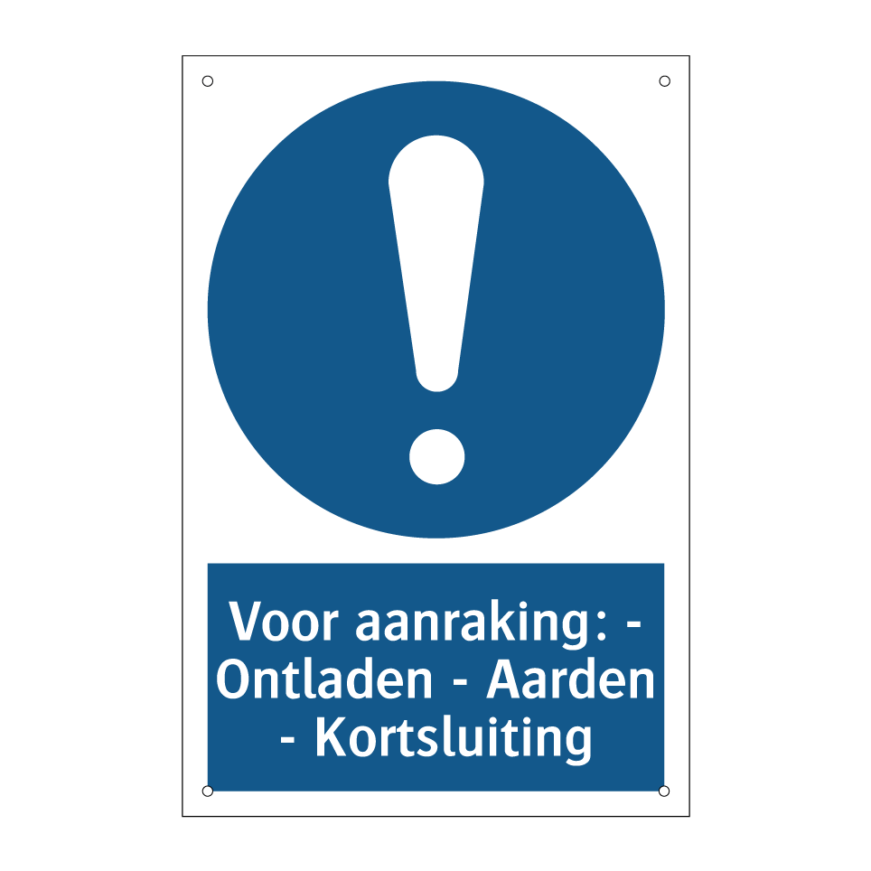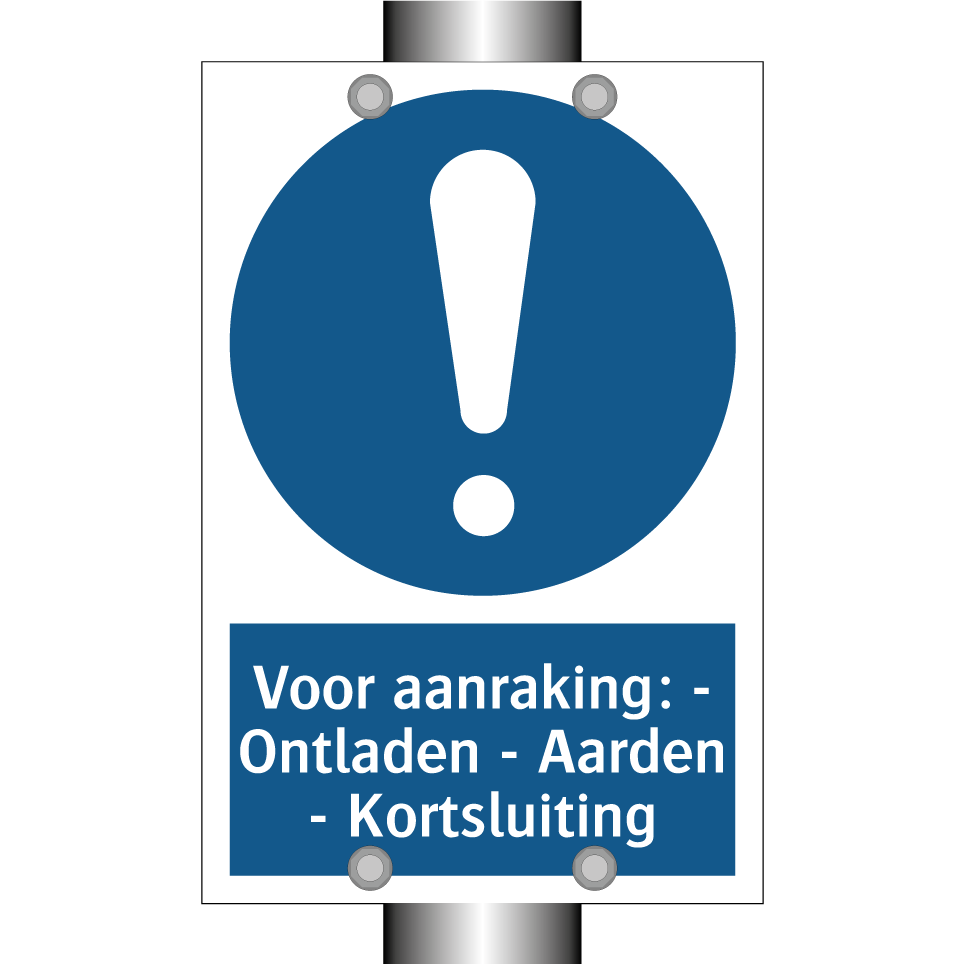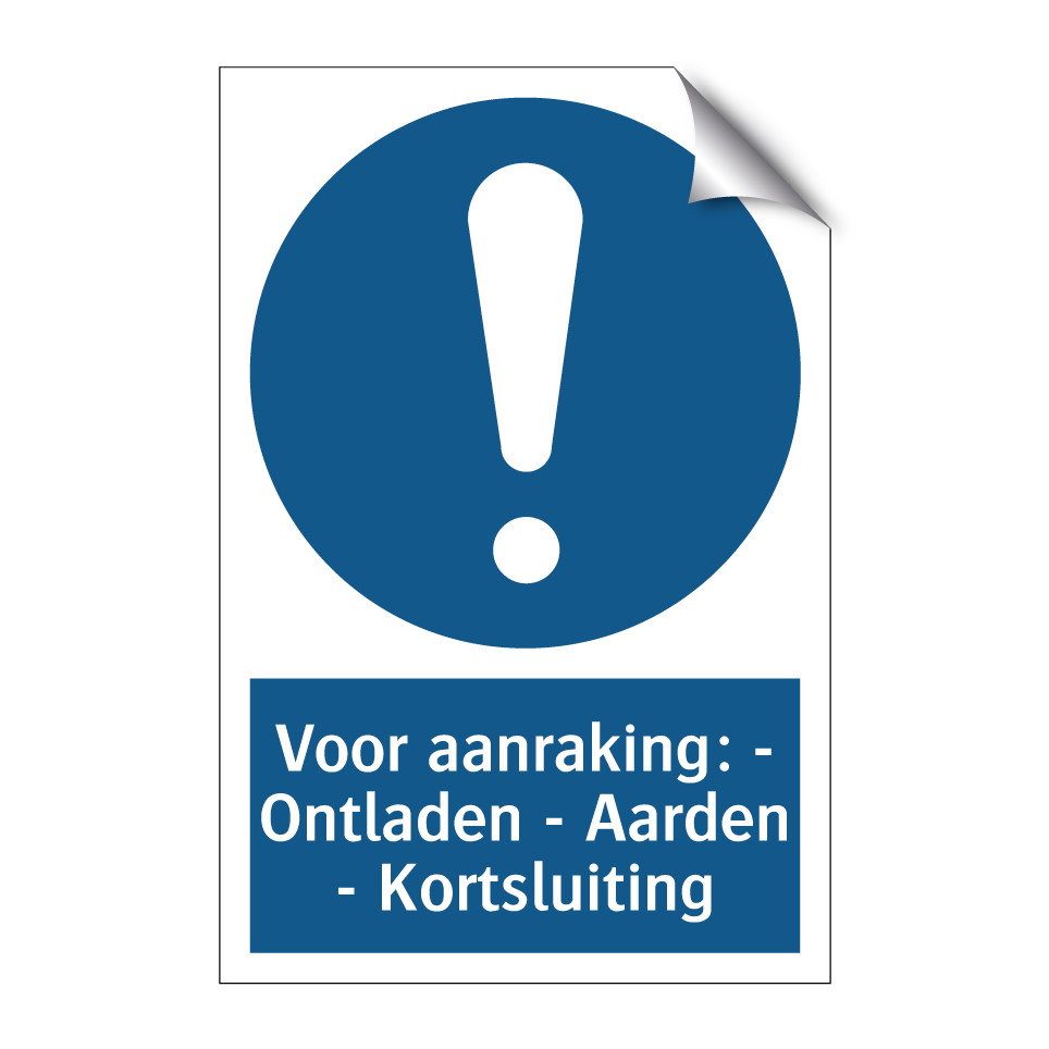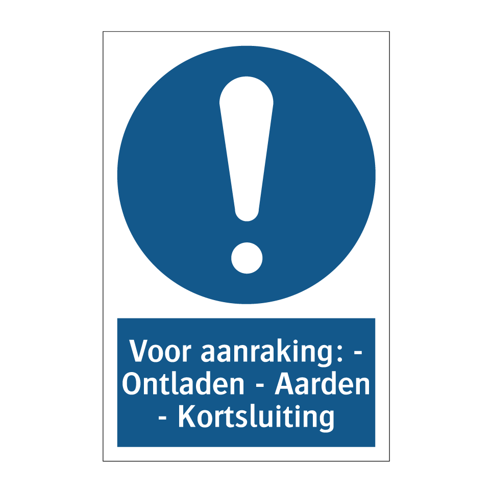 Verplichte bord met de tekst Voor aanraking: - Ontladen - Aarden - Kortsluiting