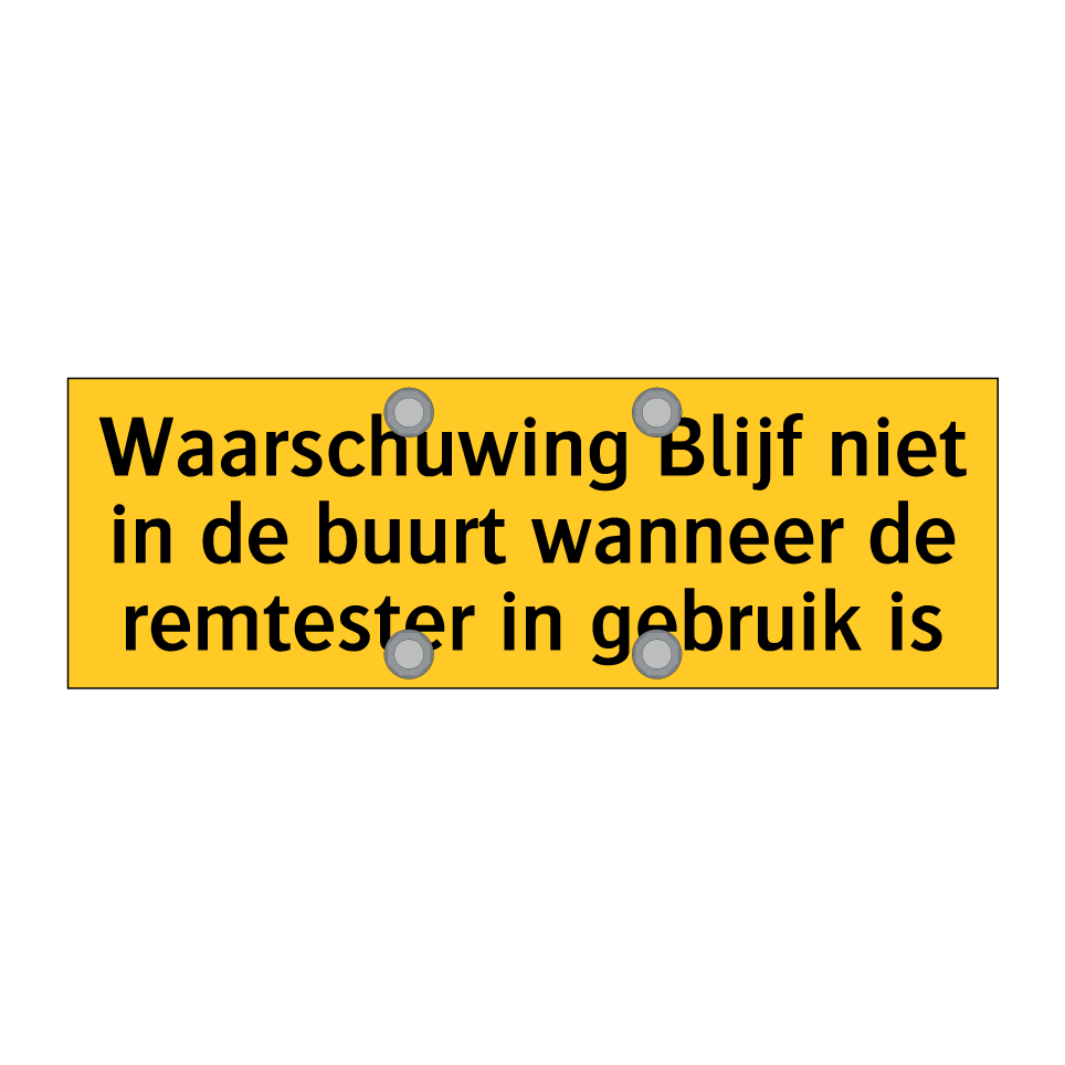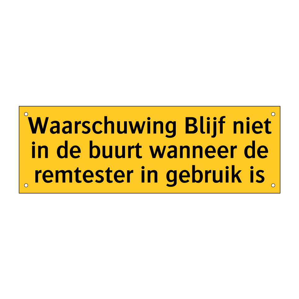 Waarschuwingsbord met de tekst Waarschuwing Blijf niet in de buurt wanneer de remtester in gebruik is