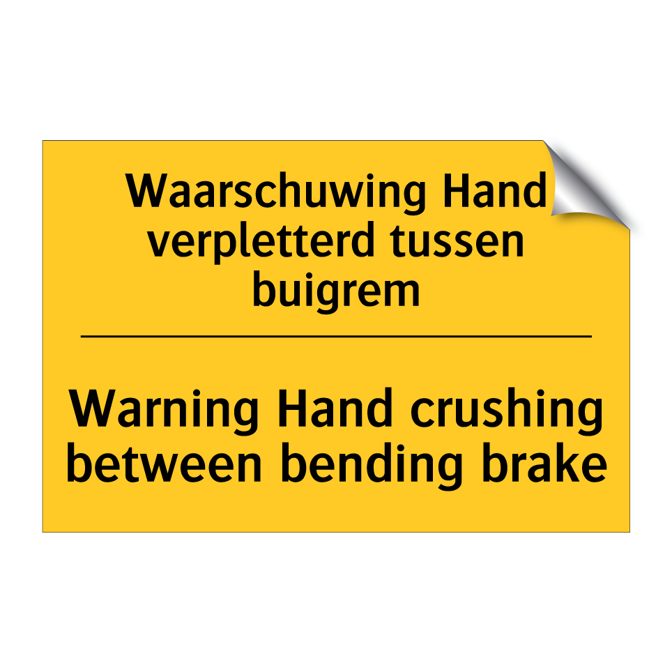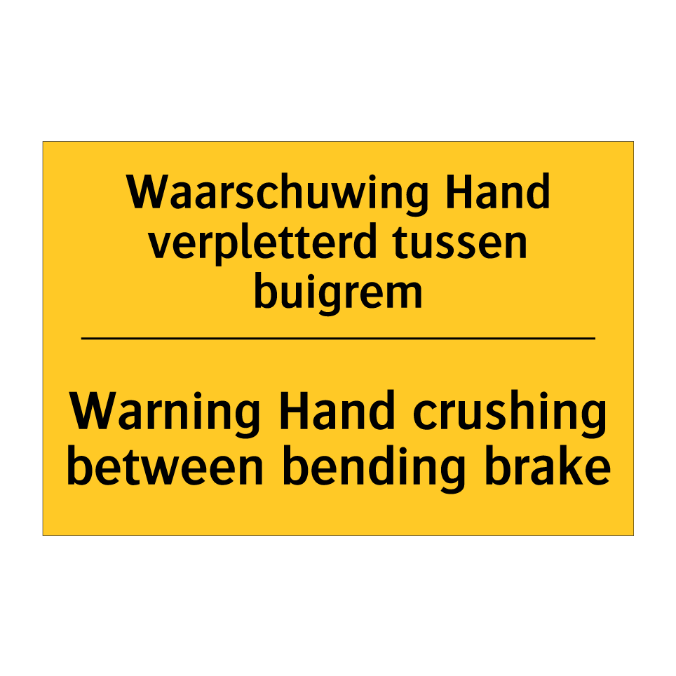Waarschuwingsbord met de tekst Waarschuwing Hand verpletterd tussen buigrem / Warning Hand crushing between bending brake