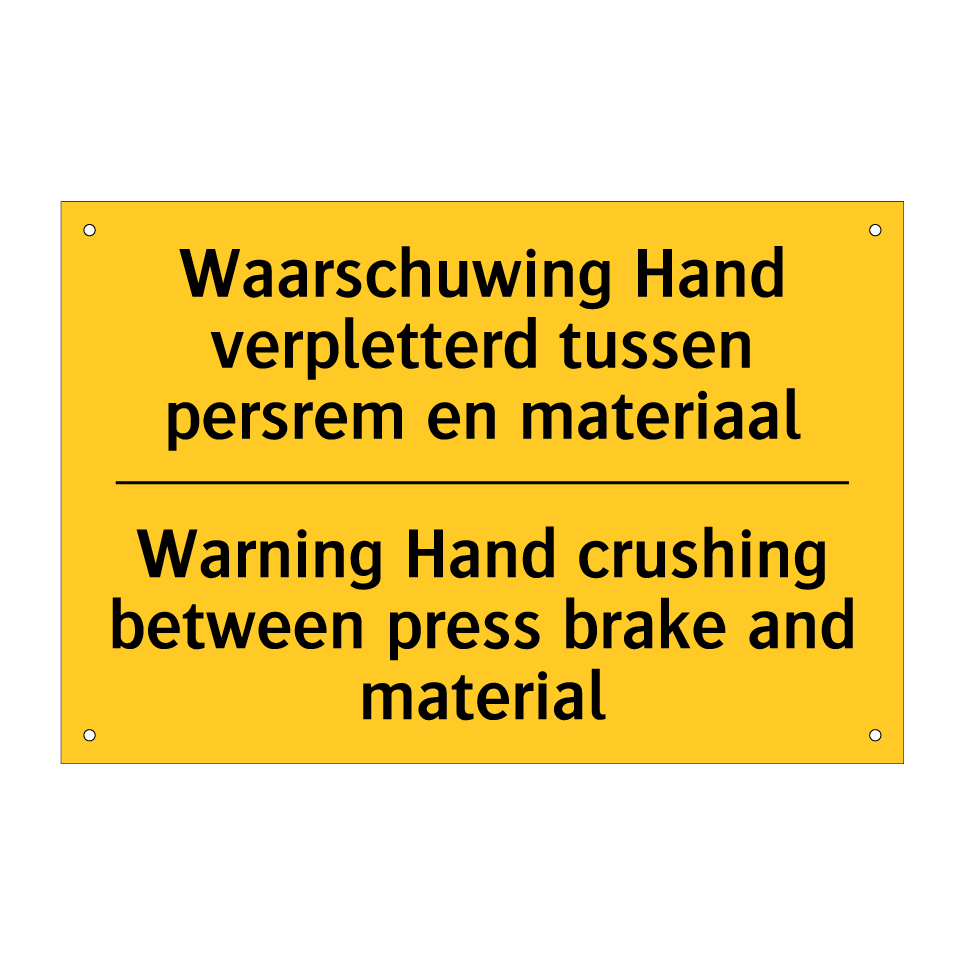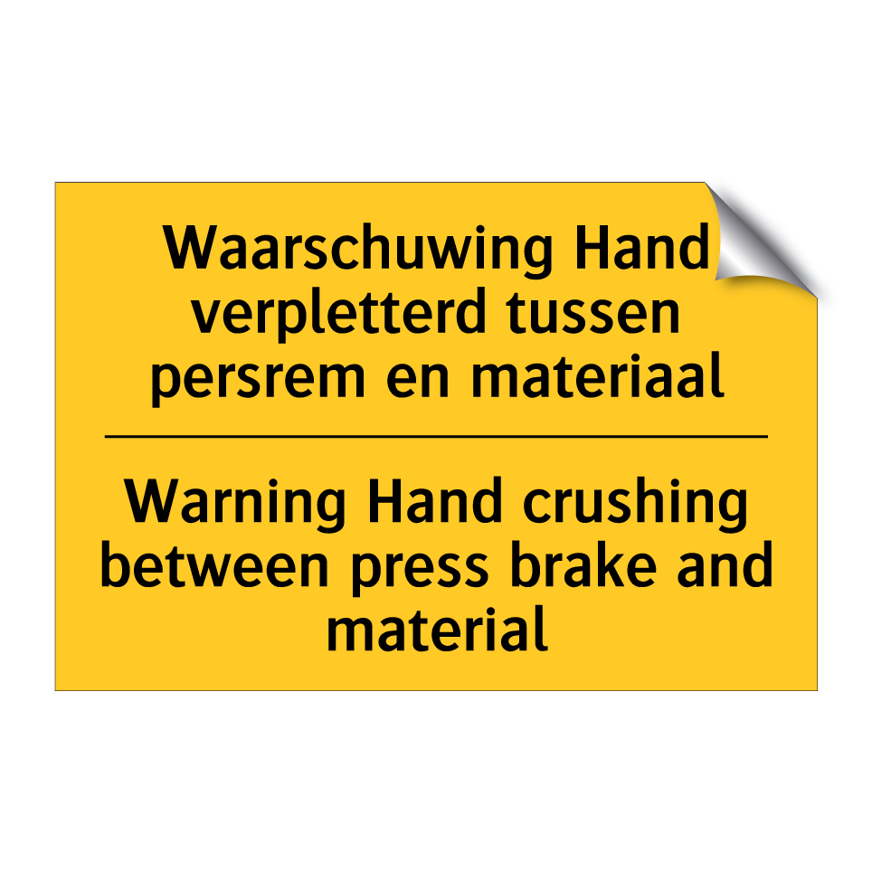 Waarschuwingsbord met de tekst Waarschuwing Hand verpletterd tussen persrem en materiaal / Warning Hand crushing between press brake and material