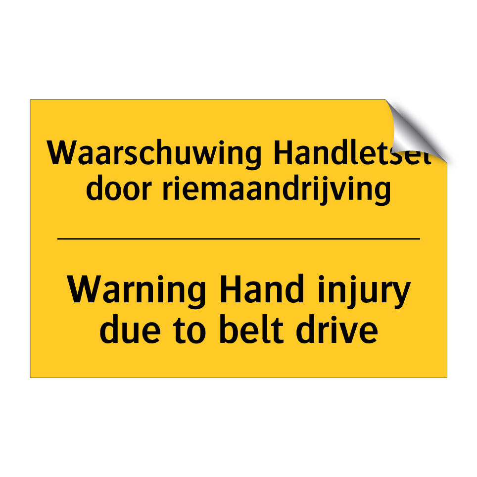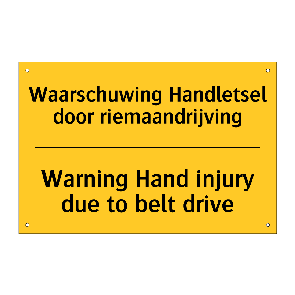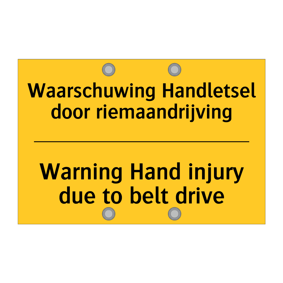 Waarschuwingsbord met de tekst Waarschuwing Handletsel door riemaandrijving / Warning Hand injury due to belt drive