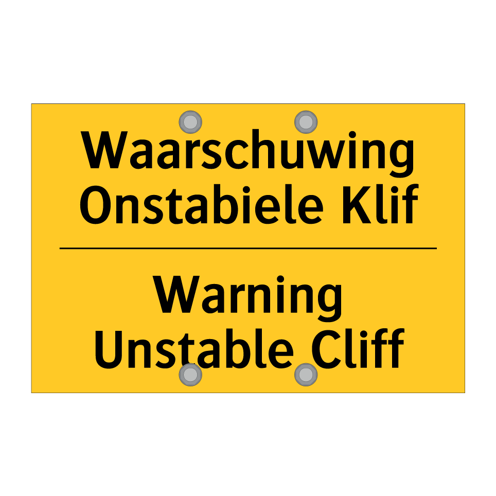 Waarschuwingsbord met de tekst Waarschuwing Onstabiele Klif / Warning Unstable Cliff