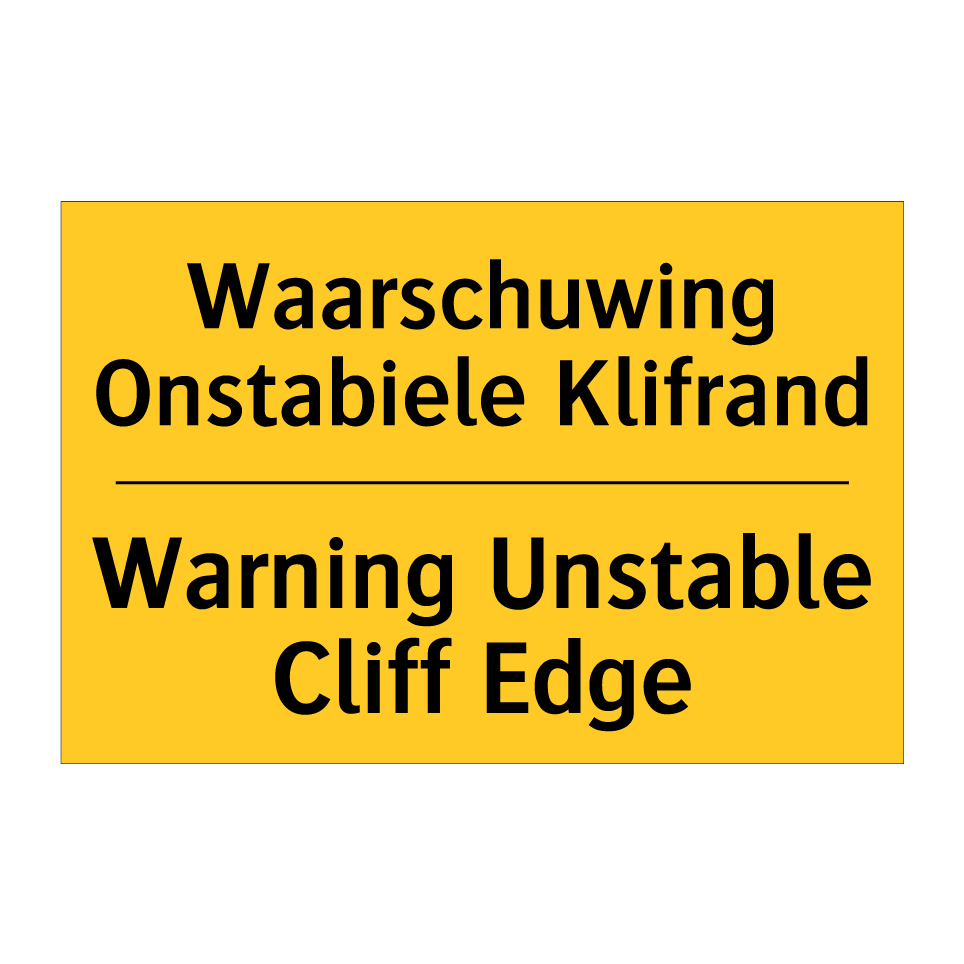Dit waarschuwingsbord met gele achtergrond en zwarte tekst is ideaal voor het markeren van gevaarlijke klifranden. De tweetalige tekst in zowel Nederlands als Engels zorgt ervoor dat zowel lokale bewoners als internationale bezoekers de waarschuwing begrijpen. Dit bordje is perfect voor gebruik in kustgebieden, wandelpaden langs kliffen en andere locaties waar instabiele randen een risico vormen. Door de duidelijke en opvallende kleuren trekt het direct de aandacht en helpt het ongelukken te voorkomen. Plaats dit waarschuwingsbord op strategische plekken om de veiligheid van iedereen te waarborgen.