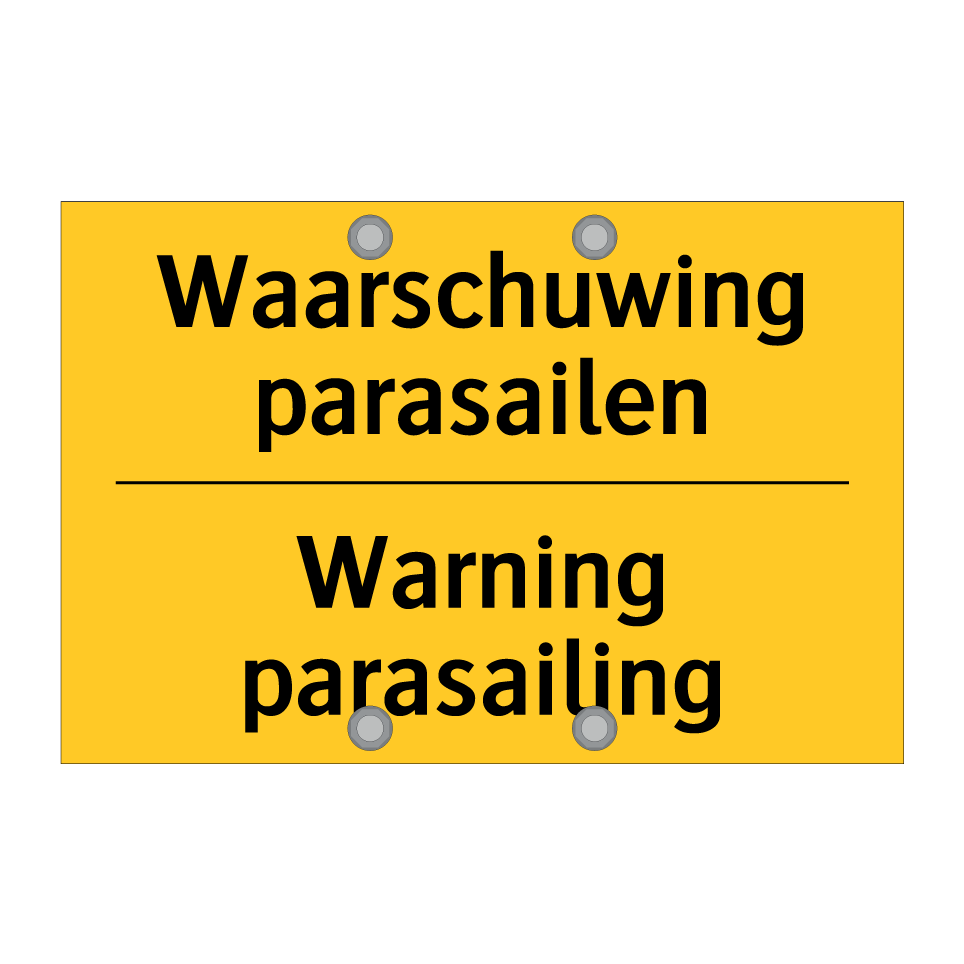 Waarschuwingsbord met de tekst Waarschuwing parasailen / Warning parasailing