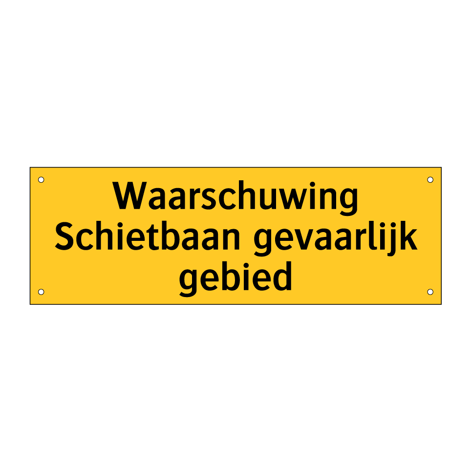 Deze waarschuwingsbord is essentieel voor het markeren van gevaarlijke schietbanen. Het dient om mensen te waarschuwen voor potentieel gevaarlijke gebieden waar schietoefeningen plaatsvinden. Plaats deze bord op strategische locaties zoals ingangen van schietbanen, langs wandelpaden in de buurt van schietterreinen, of bij toegangswegen naar militaire oefenterreinen. Door de opvallende gele achtergrond en zwarte tekst trekt het direct de aandacht en zorgt het voor een duidelijke waarschuwing. Dit waarschuwingsbord helpt ongelukken te voorkomen en verhoogt de veiligheid in risicovolle gebieden. Ideaal voor gebruik in zowel openbare als privéterreinen waar schietactiviteiten plaatsvinden.