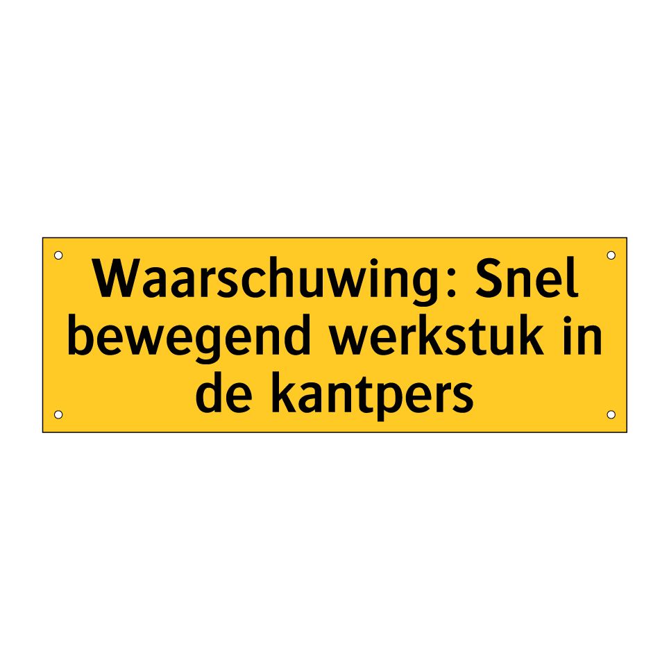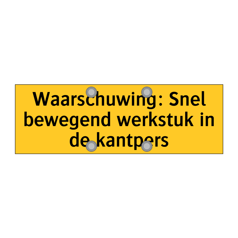 Waarschuwingsbord met de tekst Waarschuwing: Snel bewegend werkstuk in de kantpers