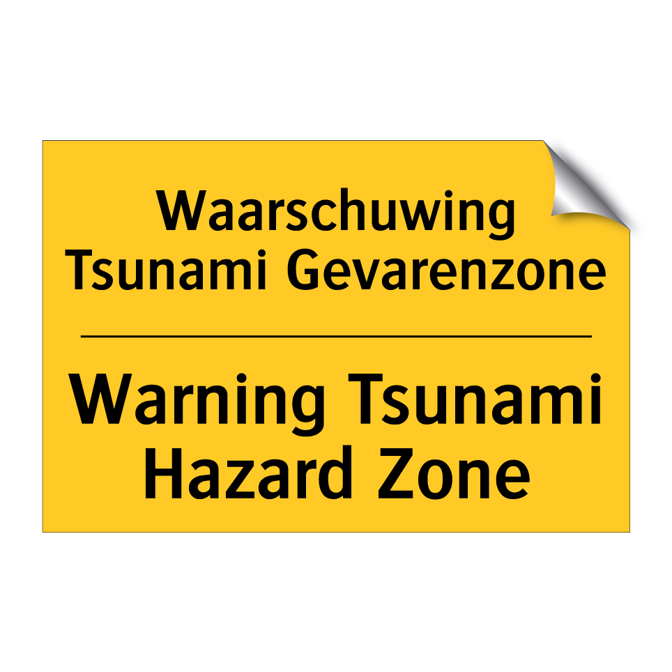 Waarschuwingsbord met de tekst Waarschuwing Tsunami Gevarenzone / Warning Tsunami Hazard Zone