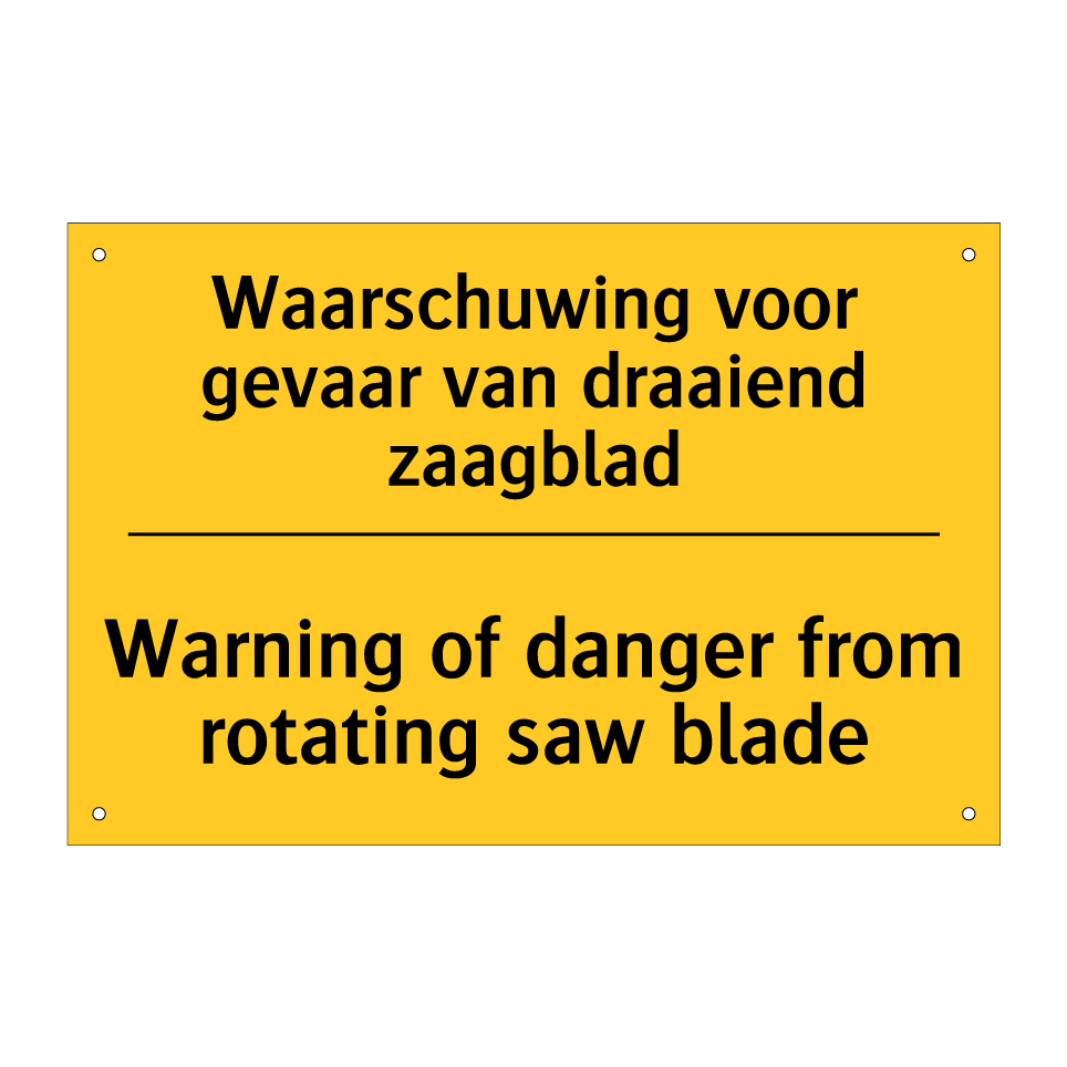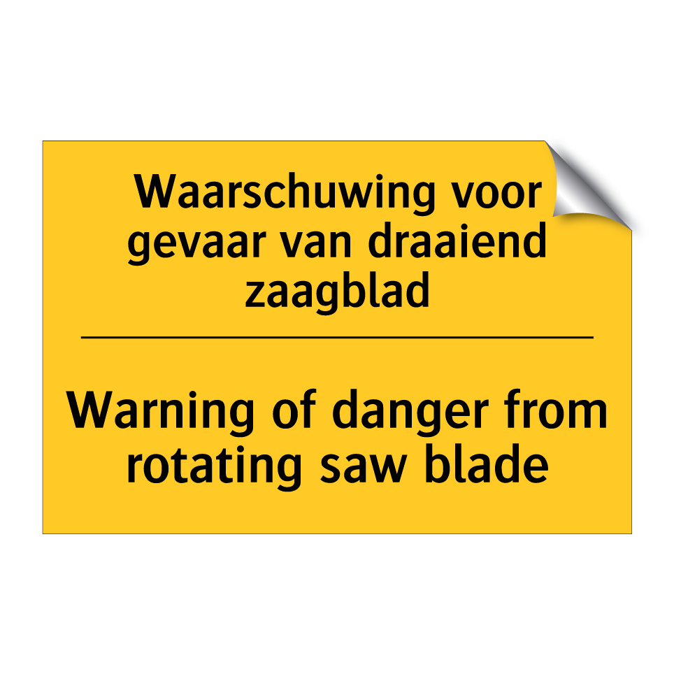 Waarschuwingsbord met de tekst Waarschuwing voor gevaar van draaiend zaagblad / Warning of danger from rotating saw blade
