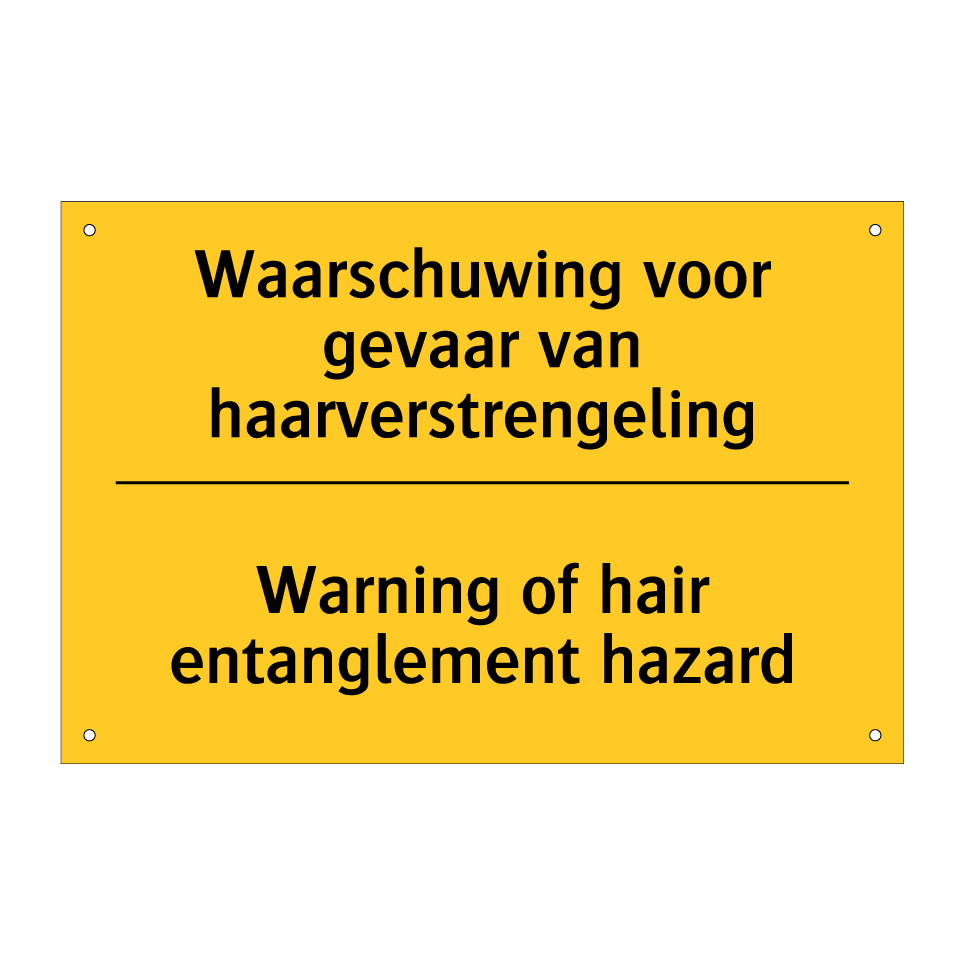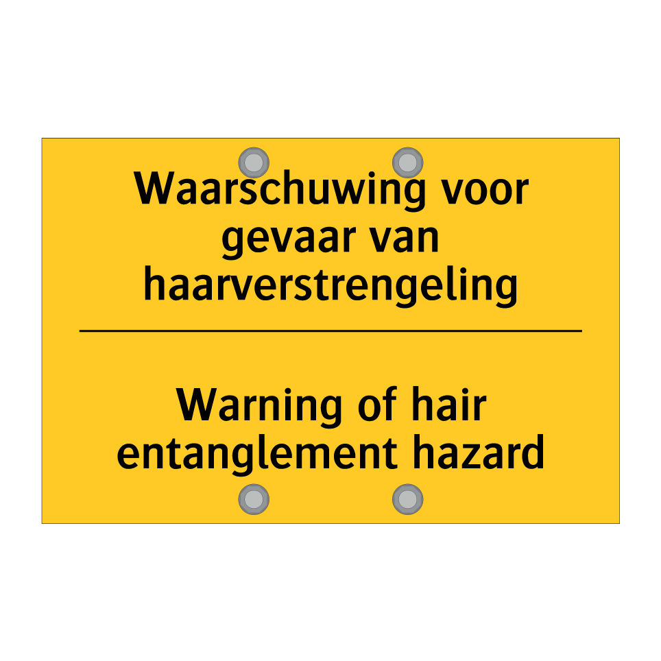 Waarschuwingsbord met de tekst Waarschuwing voor gevaar van haarverstrengeling / Warning of hair entanglement hazard