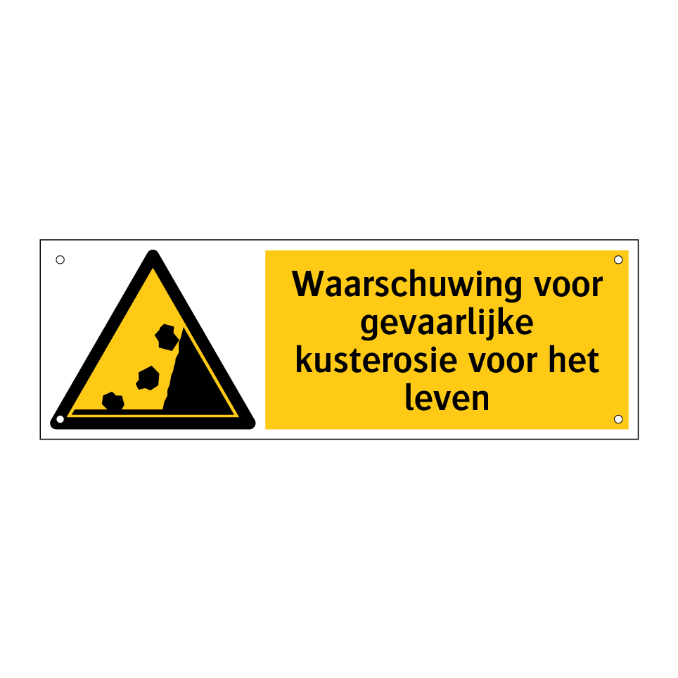Waarschuwingsbord met de tekst Waarschuwing voor gevaarlijke kusterosie voor het leven