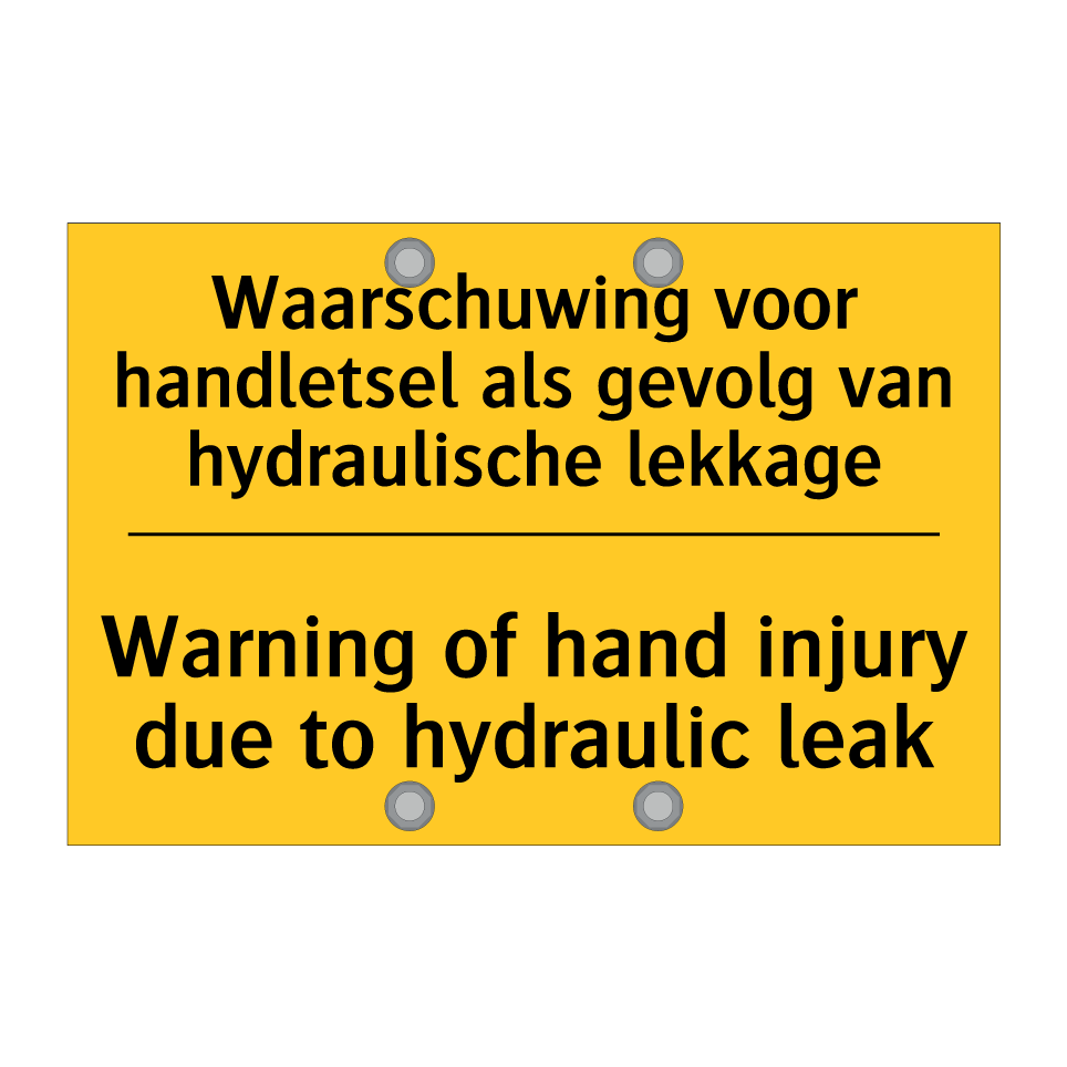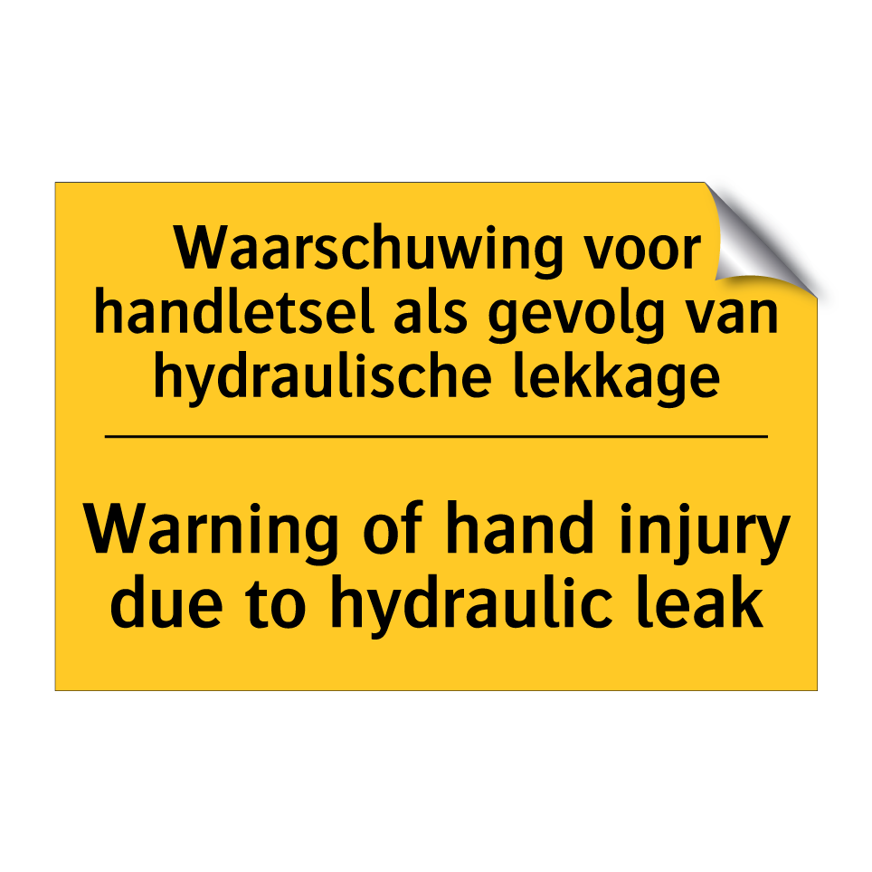Waarschuwingsbord met de tekst Waarschuwing voor handletsel als gevolg van hydraulische lekkage / Warning of hand injury due to hydraulic leak