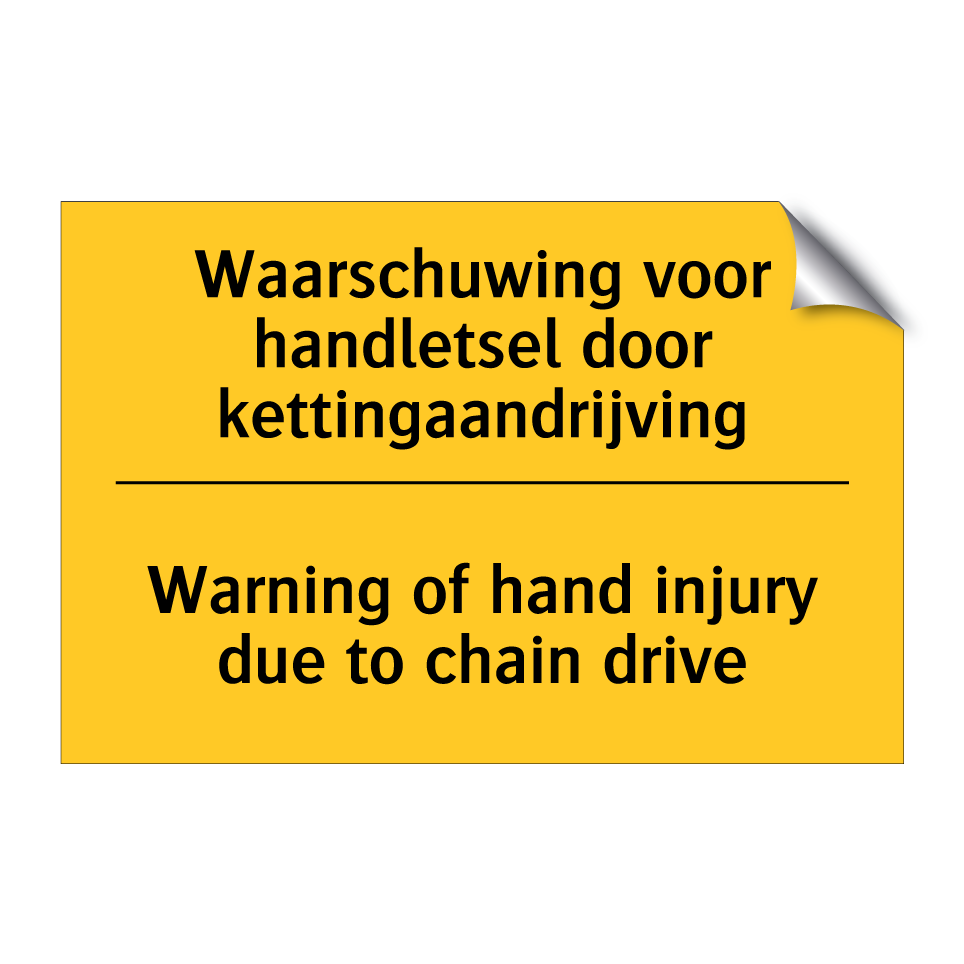Waarschuwingsbord met de tekst Waarschuwing voor handletsel door kettingaandrijving / Warning of hand injury due to chain drive
