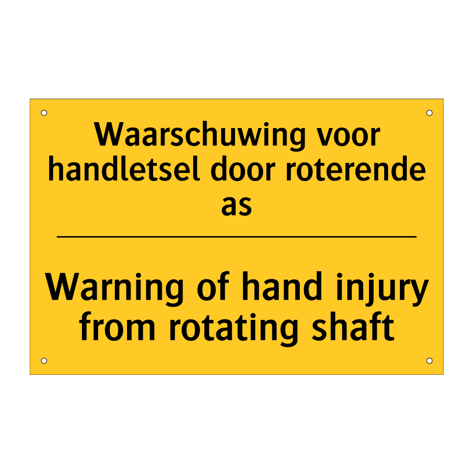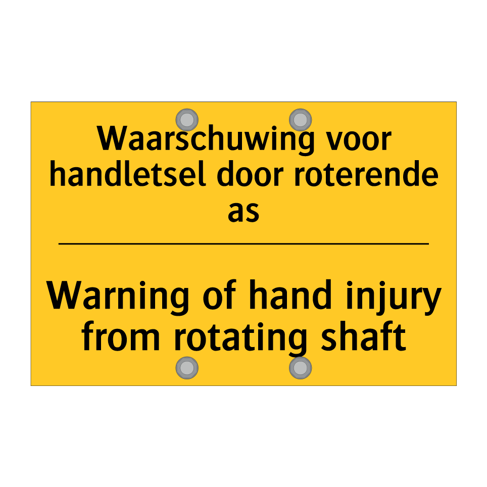Waarschuwingsbord met de tekst Waarschuwing voor handletsel door roterende as / Warning of hand injury from rotating shaft