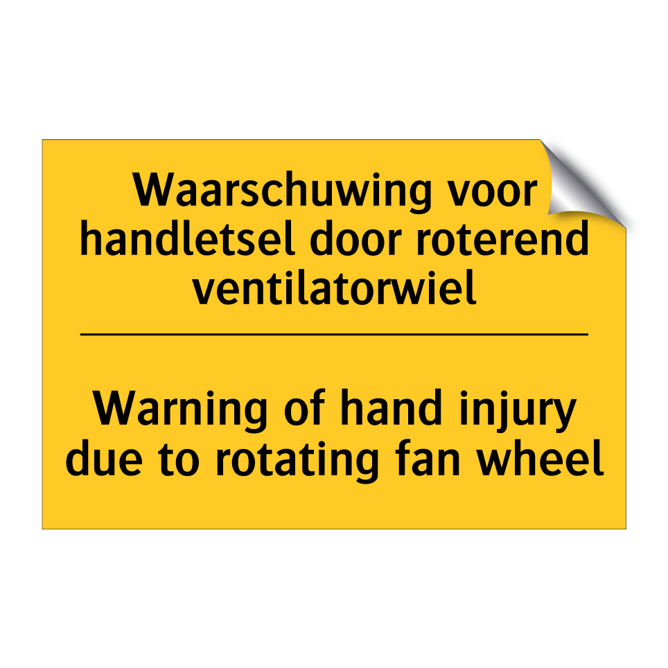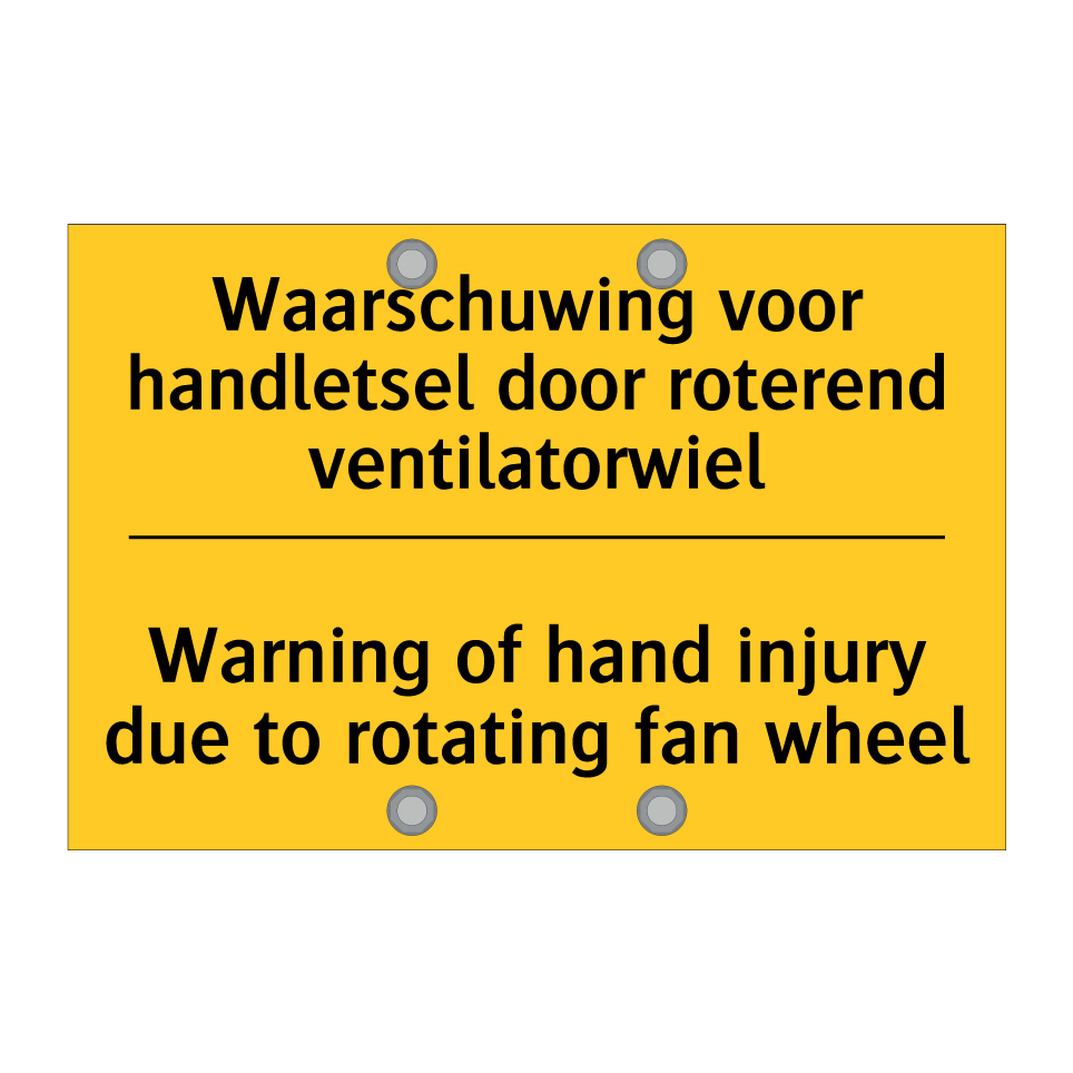 Waarschuwingsbord met de tekst Waarschuwing voor handletsel door roterend ventilatorwiel / Warning of hand injury due to rotating fan wheel