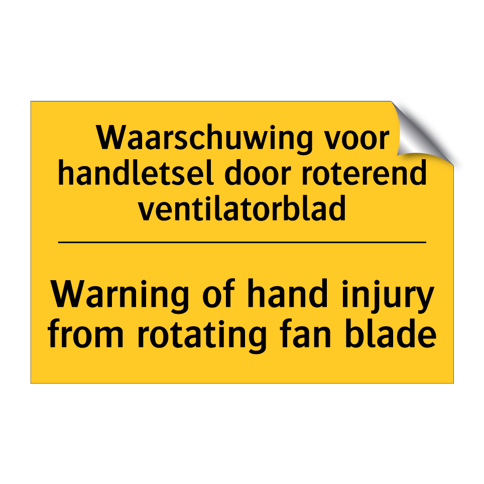 Waarschuwingsbord met de tekst Waarschuwing voor handletsel door roterend ventilatorblad / Warning of hand injury from rotating fan blade