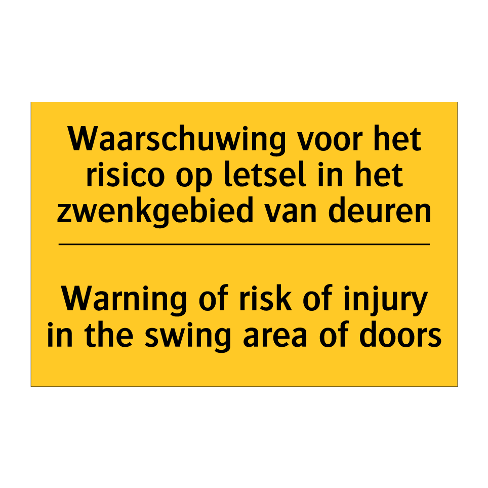Waarschuwingsbord met de tekst Waarschuwing voor het risico op letsel in het zwenkgebied van deuren / Warning of risk of injury in the swing area of doors