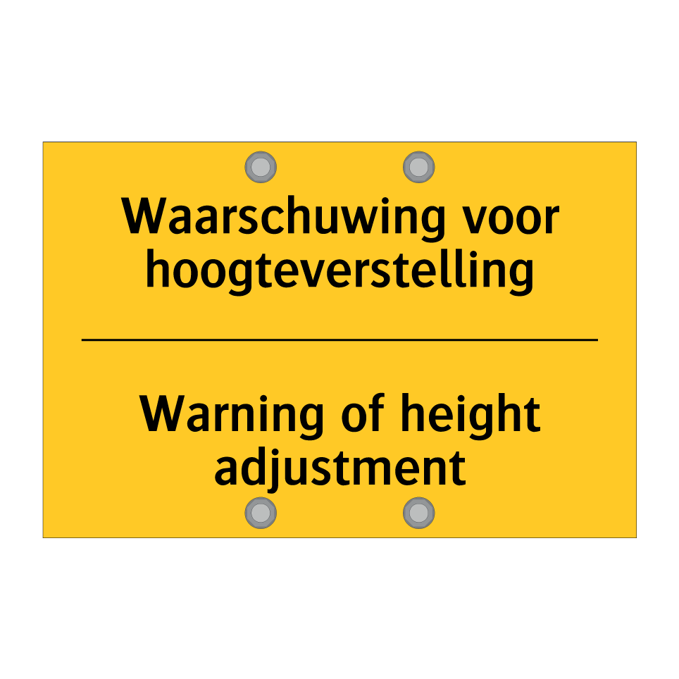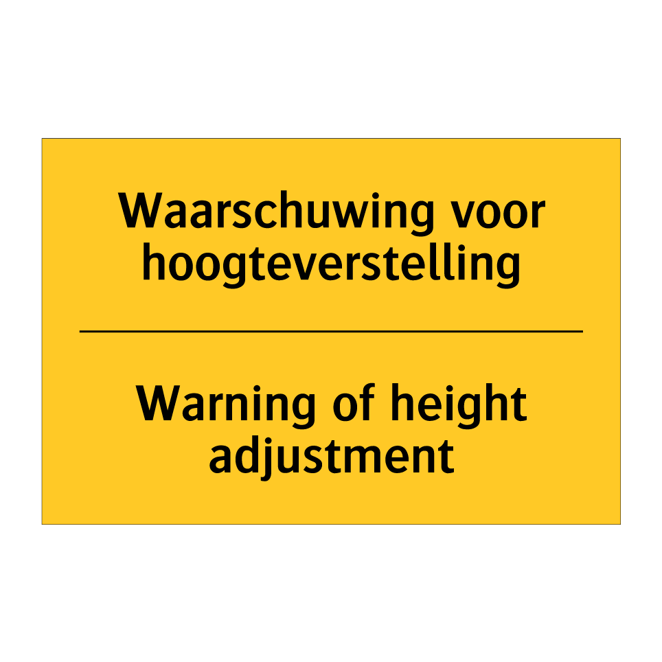 Waarschuwingsbord met de tekst Waarschuwing voor hoogteverstelling / Warning of height adjustment