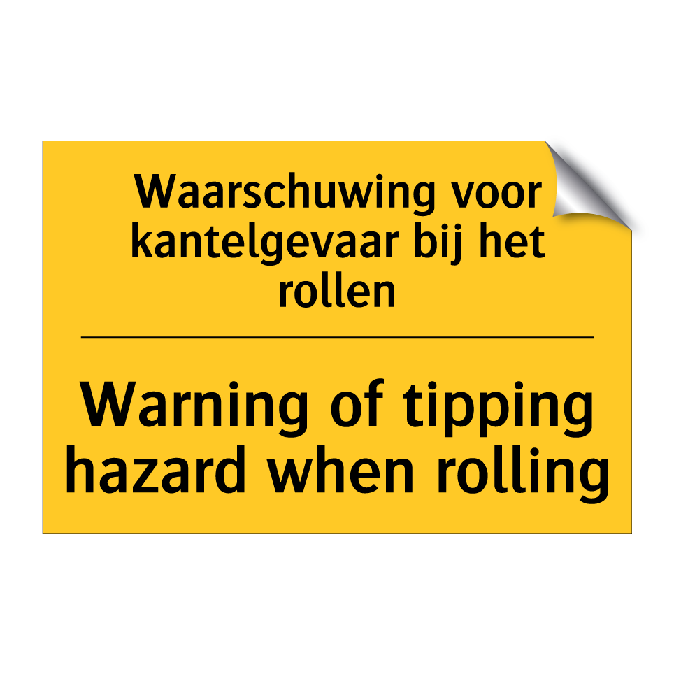 Waarschuwingsbord met de tekst Waarschuwing voor kantelgevaar bij het rollen / Warning of tipping hazard when rolling