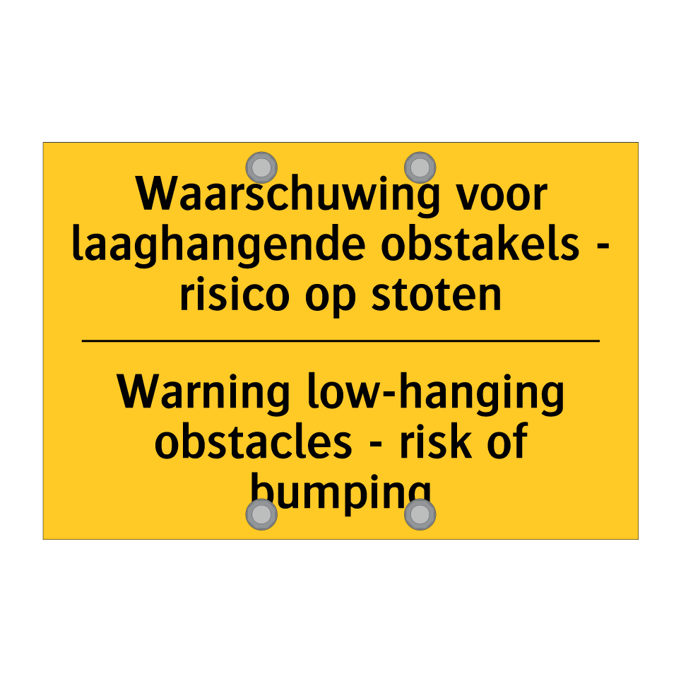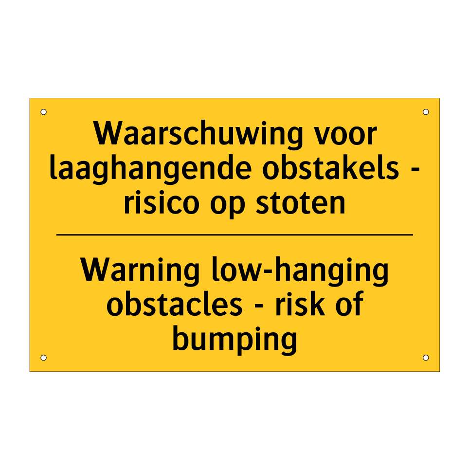 Waarschuwingsbord met de tekst Waarschuwing voor laaghangende obstakels - risico op stoten / Warning low-hanging obstacles - risk of bumping