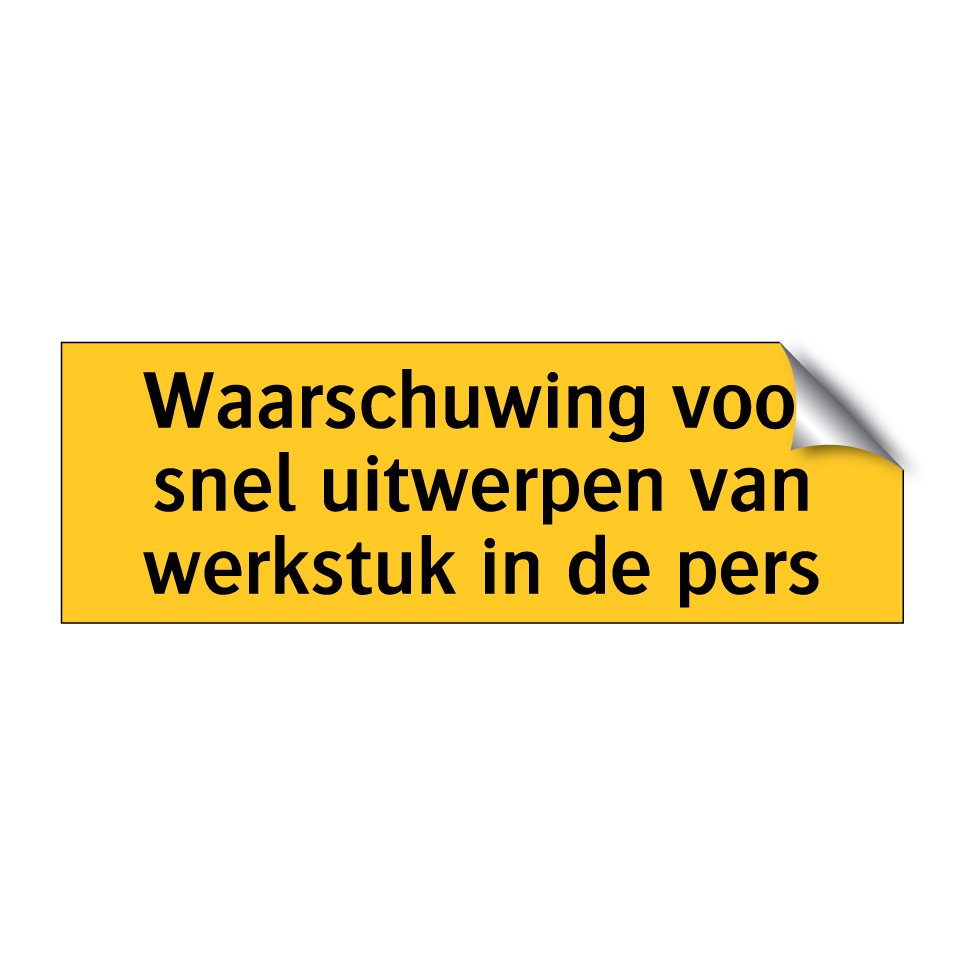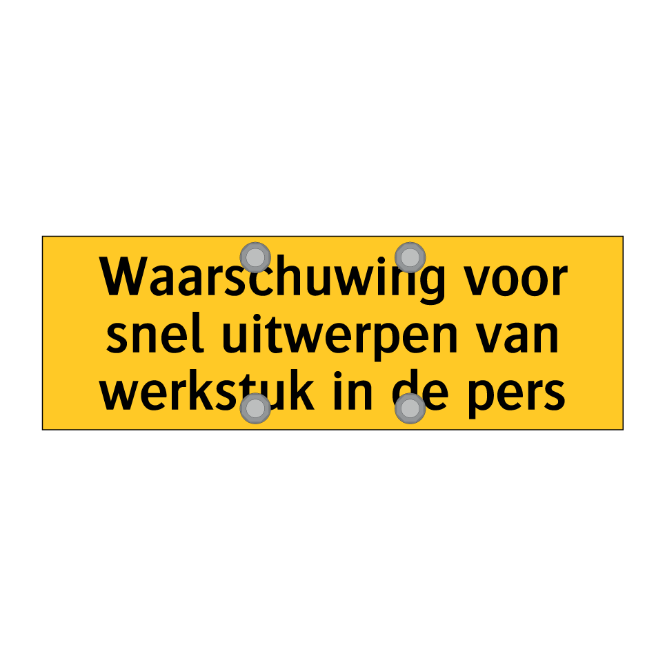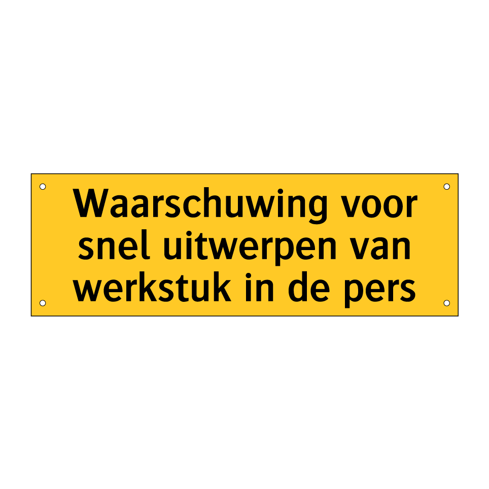 Waarschuwingsbord met de tekst Waarschuwing voor snel uitwerpen van werkstuk in de pers