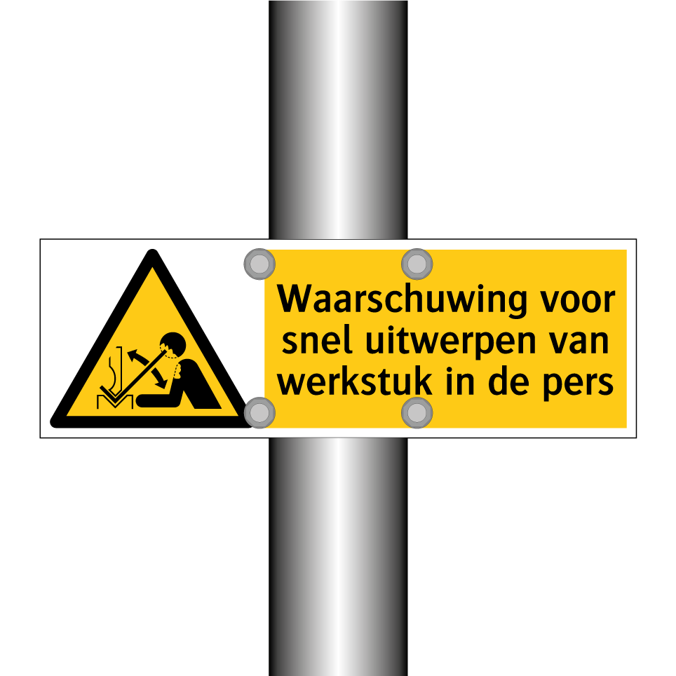 Waarschuwingsbord met de tekst Waarschuwing voor snel uitwerpen van werkstuk in de pers