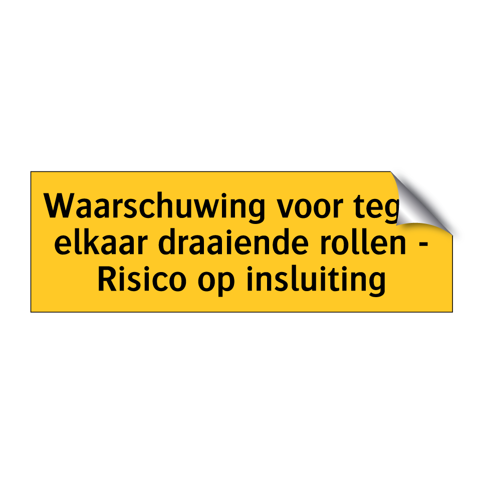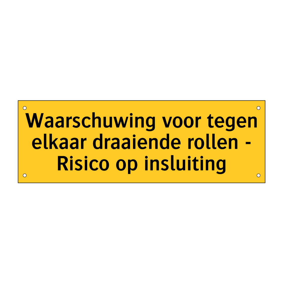 Waarschuwingsbord met de tekst Waarschuwing voor tegen elkaar draaiende rollen - Risico op insluiting