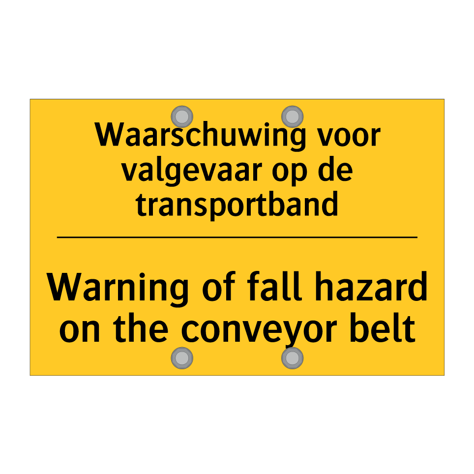 Dit waarschuwingsbord met gele achtergrond en zwarte tekst is ideaal voor het markeren van gevaarlijke situaties rondom transportbanden. De tweetalige tekst in zowel Nederlands als Engels zorgt ervoor dat zowel lokale als internationale werknemers de waarschuwing begrijpen, wat de veiligheid op de werkvloer aanzienlijk verhoogt. Plaats Dit bordje in de buurt van transportbanden in fabrieken, magazijnen of andere industriële omgevingen waar valgevaar aanwezig is. Door de duidelijke en opvallende kleuren trekt het bord direct de aandacht, waardoor ongelukken voorkomen kunnen worden. Dit waarschuwingsbord is een essentiële toevoeging voor elke werkplek waar veiligheid prioriteit heeft.