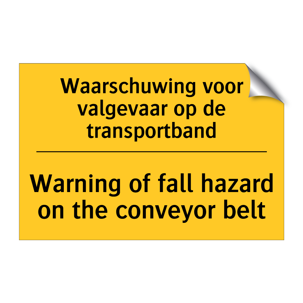 Waarschuwingsbord met de tekst Waarschuwing voor valgevaar op de transportband / Warning of fall hazard on the conveyor belt