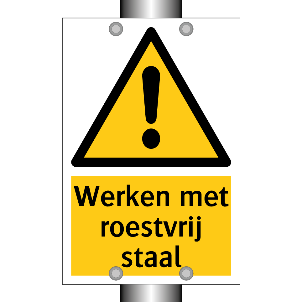 Waarschuwingsbord met de tekst Werken met roestvrij staal