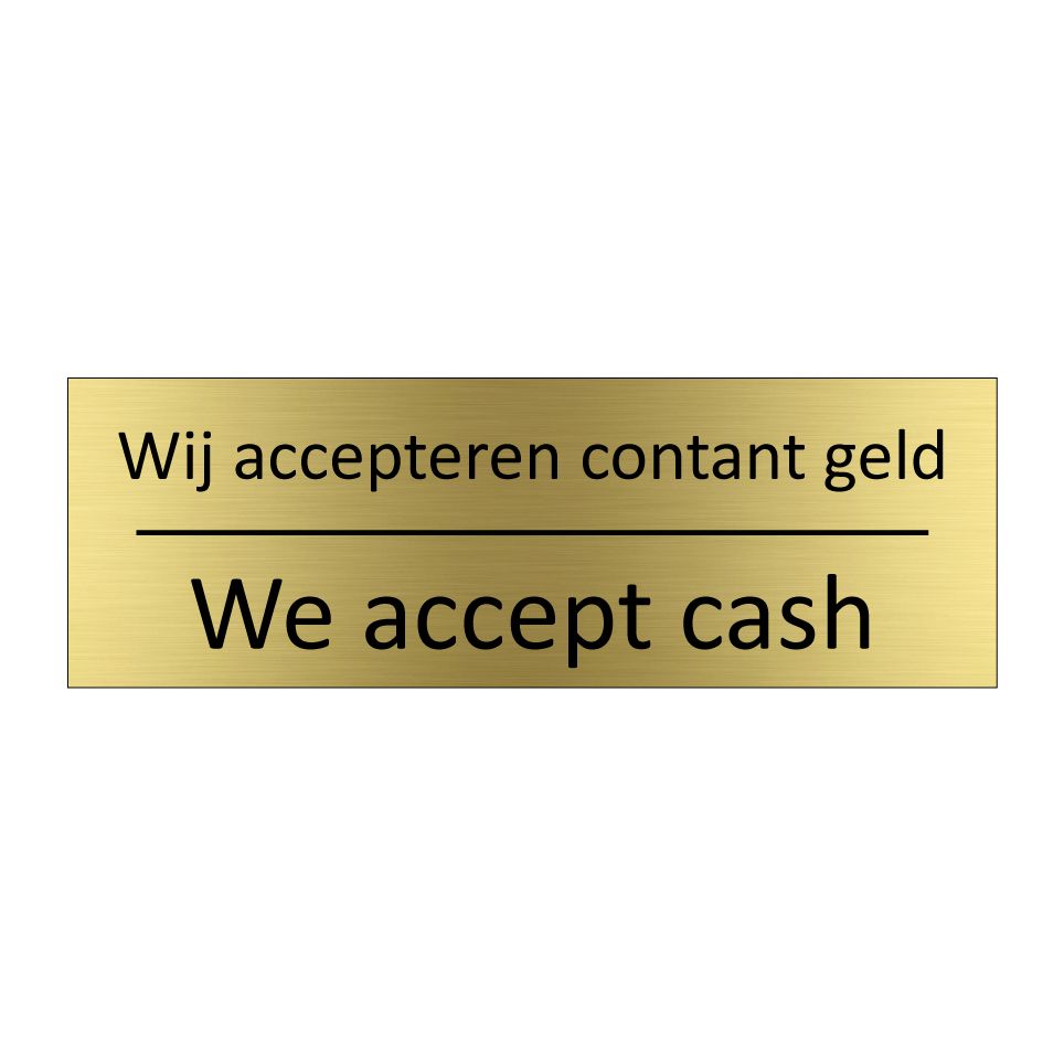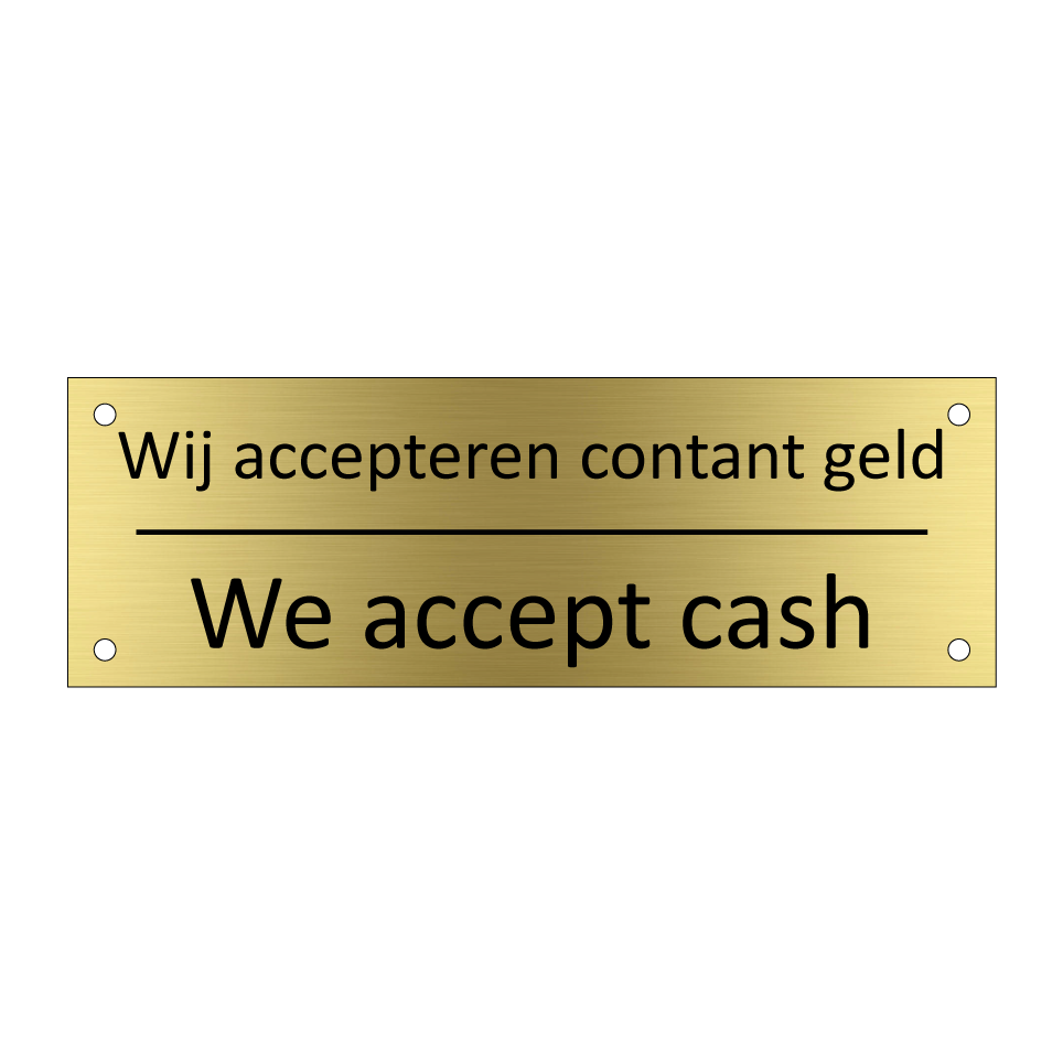 Informatiebord met tekst in het nederlands en engels. Dit bord luidt: Wij accepteren contant geld evenals met de engelse vertaling We accept cash.
